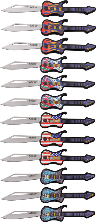 3.75" closed. 2.5" satin finish stainless clip point blade. Guitar shaped aluminum handle. Pocket clip. Thumb pull. 12 pieces-three each... Read more