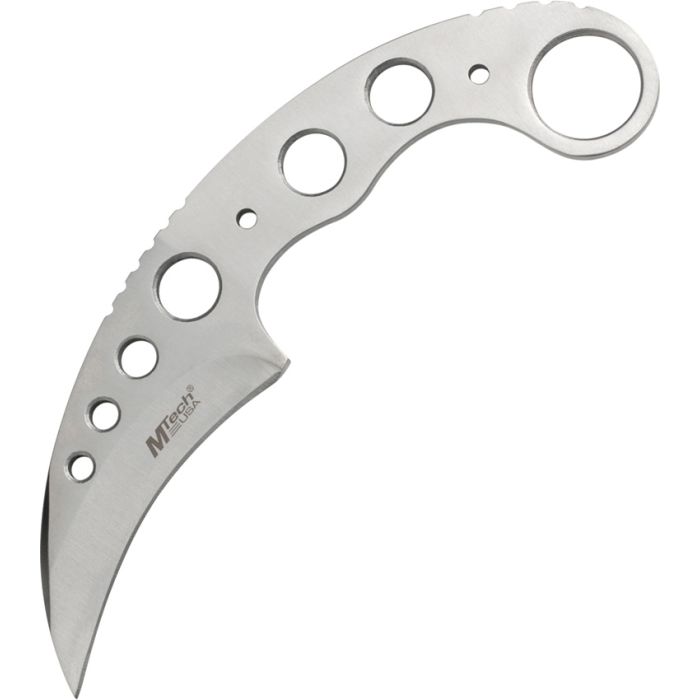7" overall. 3.25" silver finish 440 stainless karambit blade. Finger ring. Machined hole cutouts. black molded plastic belt sheath.Please note... Read more