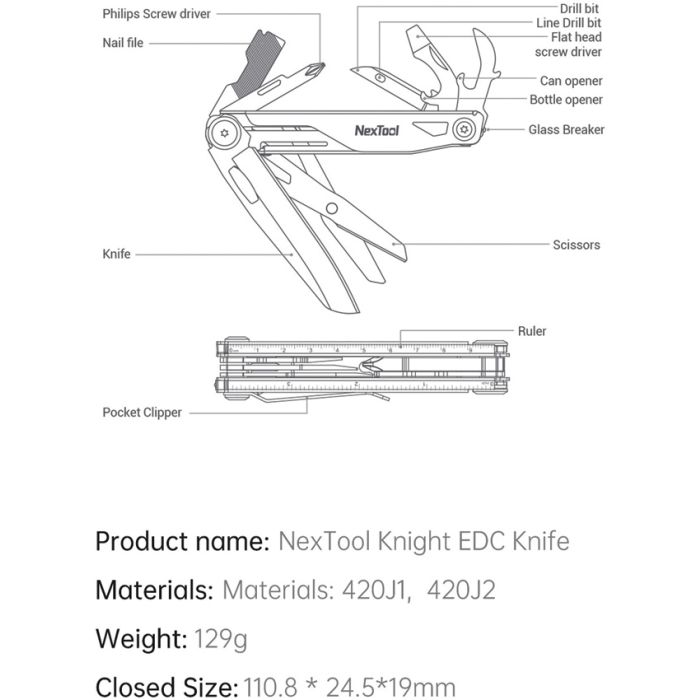 4.38" closed. Black aluminum handles. Tools include: Phillips screwdriver l File l Large blade l Pocket clip l Scissors l... Read more