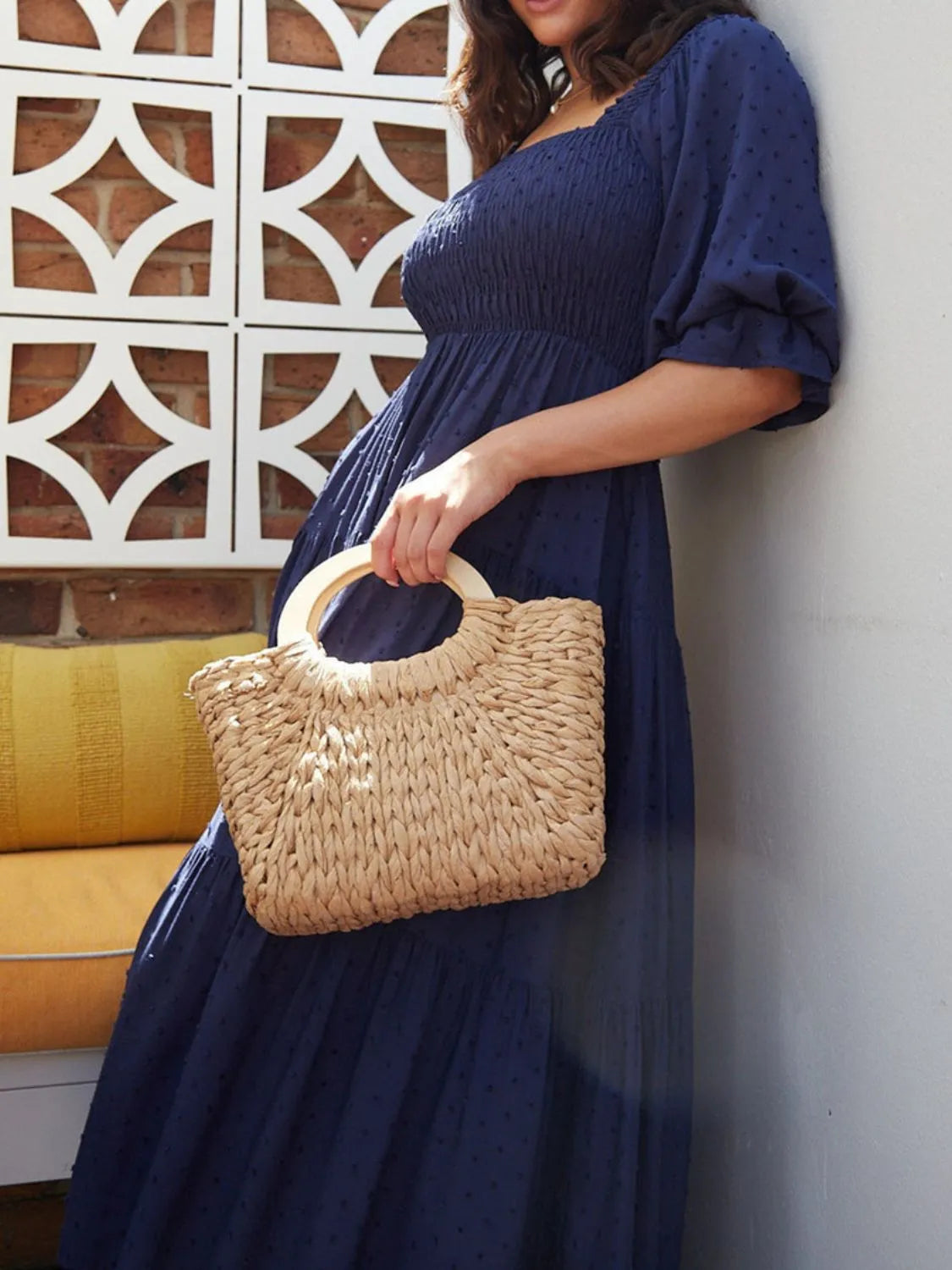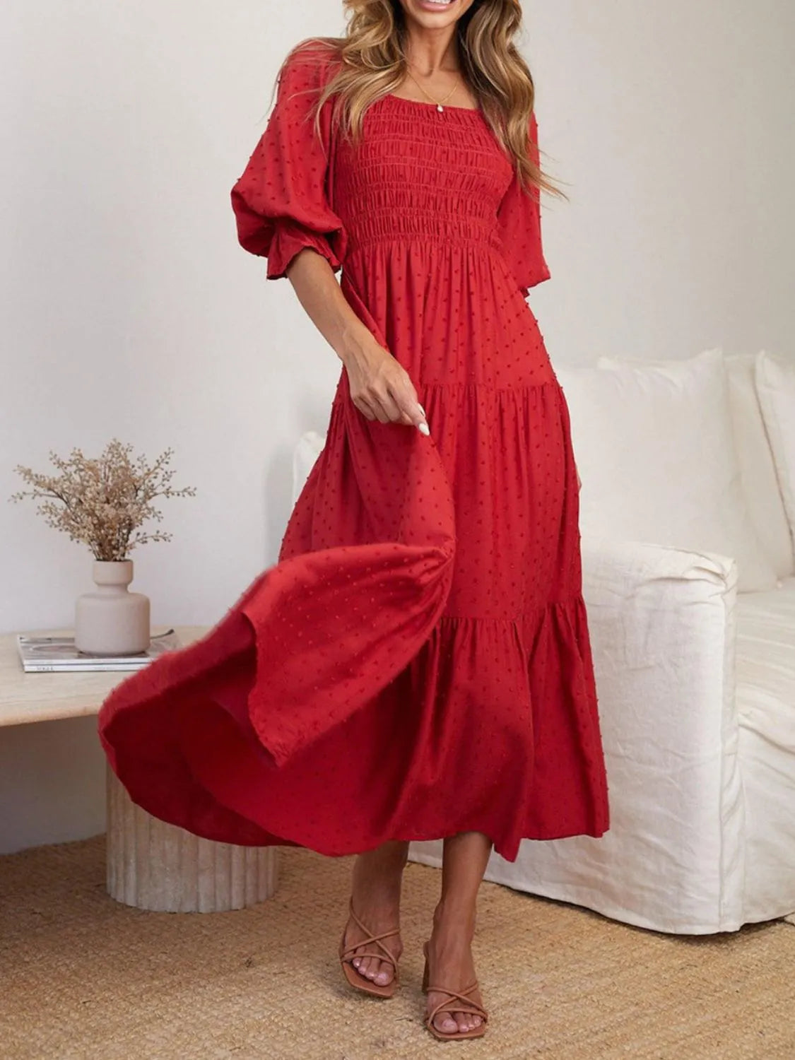 Smocked Swiss Dot Square Neck Flounce Sleeve Dress