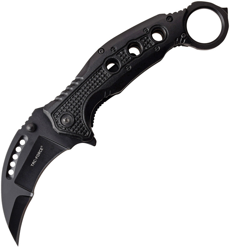 Assisted opening. 5.5" closed. 3" black finish 3Cr13 stainless karambit blade. Black anodized aluminum handle. Extended tang. Thumb stud. Glass... Read more