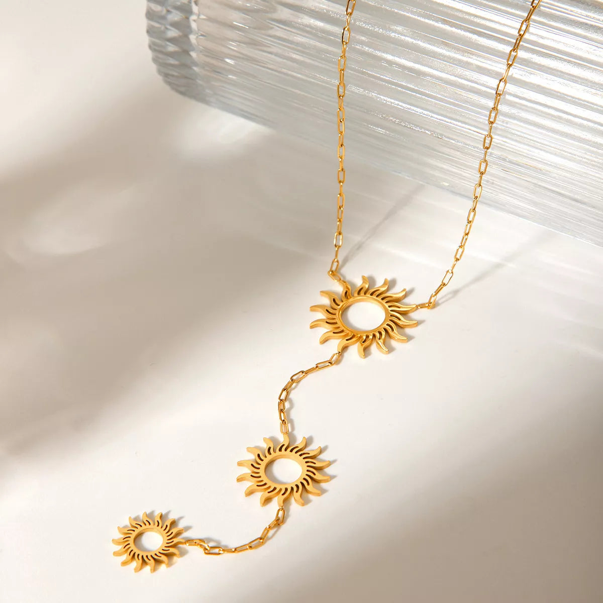 This stunning 18K Gold-Plated Sun Pendant Necklace features a beautifully crafted celestial sun charm suspended from a delicate gold-plated chain. The pendant showcases intricate sun ray details that catch and reflect light beautifully. Made with high-quality 18K gold plating over base metal for durability and tarnish resistance. The necklace offers versatile styling options, perfect for layering with other pieces or wearing alone as a statement accessory. Ideal for women who appreciate celestial-themed jewelry and elegant minimalist designs. The adjustable chain ensures comfortable fit while the sun pendant adds a touch of warmth and positive energy to any outfit.