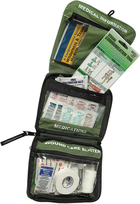 Dimensions: 7.5" x 5.5" x 1.5". Includes: (6) 1" x 3" adhesive bandage; (2) Knuckle bandage; (5) Butterfly bandage; (1) 2" conforming gauze bandage; (3) 2" x 2" sterile gauze bandage; (2) 4" x 4" sterile gauze dressing; (2) 3" x 4" non-adherent dressing; (1) pair Nitrile gloves; (1) 2" x 2" orange Biohazard label; (1) 5" x 8" Ziplock bag; (1) Large oval GlacierGel; (1) Small rectangular Glaciergel; (14) Pre-cut Moleskin pieces; (1) Pencil; (3) Safety pins; (1) Forceps; (2) Disposable thermometer; (1) 6" x 8" plastic bag; (1) Guide to Wilderness and Travel Medicine; (1) Patient assessment form; (1) Visual communication tool; (4) Acetaminophen (500mg); (2) Antacid; (4) Antihistamine (Diphenhydramine 25mg); (1) Oral rehydration salts; (4) Diamode (Loperamide HCI 2 mg); (2) Diotame (Bismuth Subsalicylate); (4) Ibuprofen (200mg); (5) Antiseptic wipe; (2) Cotton tip applicator; (1) Cloth tape, 0.5" x 10yds; (2) Triple antibiotic ointment, single use. Comes in nylon zippered carry bag. Bulk packed.Please note that this collection requires a minimum purchase of $100.00 threshold.
