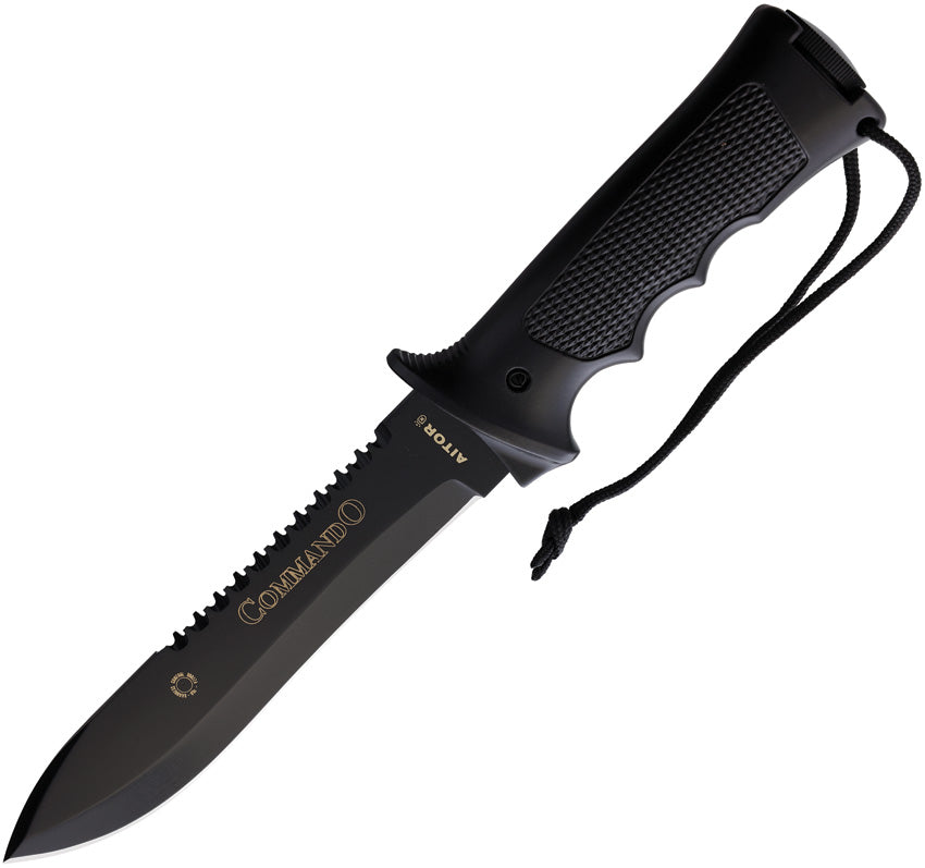 12.25" (31.12cm) overall. 7" (17.78cm) black finish sawback stainless blade. Black checkered aluminum handle. Lanyard hole. Hollow handle contains survival... Leer más...