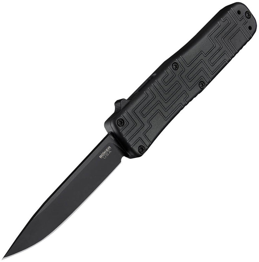 Automatic opening. 4.5" (11.43cm) closed. 3.5" (8.89cm) black PVD coated 154CM stainless blade. Black textured aluminum handle. Pocket clip. Push... Leer más...