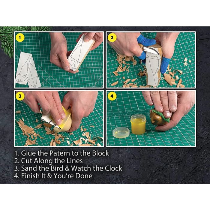 Includes: (2) wooden blocks (cherry and basswood); Whittling knife; Comfort bird template; Leather strop with polishing compound; Safety tape; Sand... Leer más...