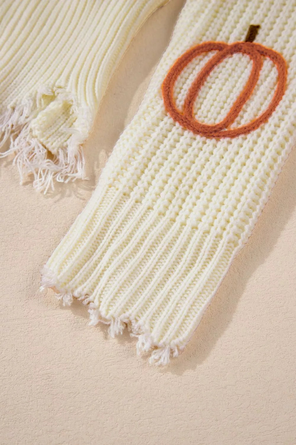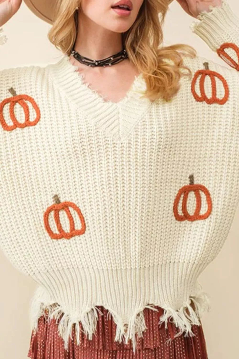 Cable Knit Pumpkin Raw Hem V Neck Loose Sweater