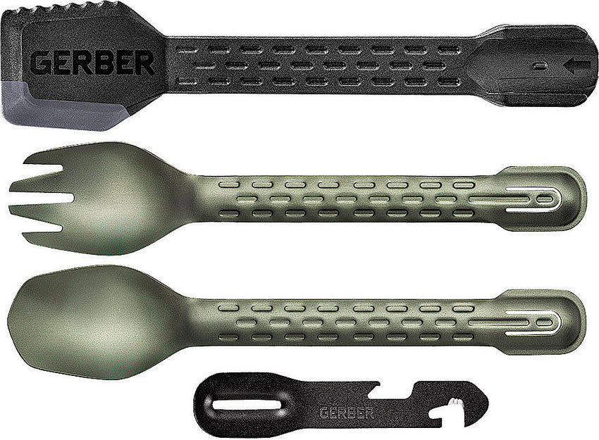 7.75" overall. Aluminum fork, aluminum spoon, nylon spatula with silicone overmold, and four function multi-tool. Tools include: Bottle opener, veggie... Leer más...