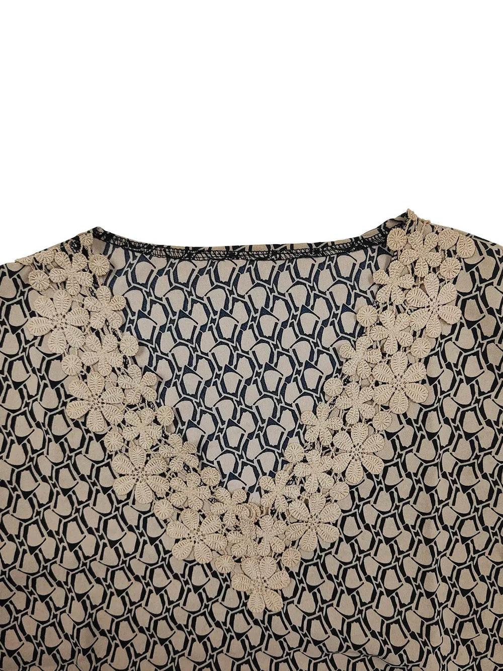 Lace Detail Printed V-Neck Flounce Sleeve Blouse