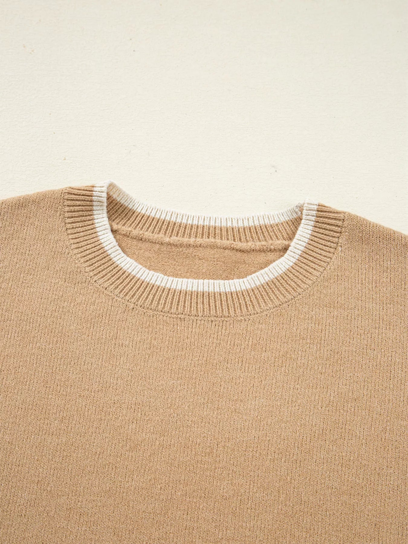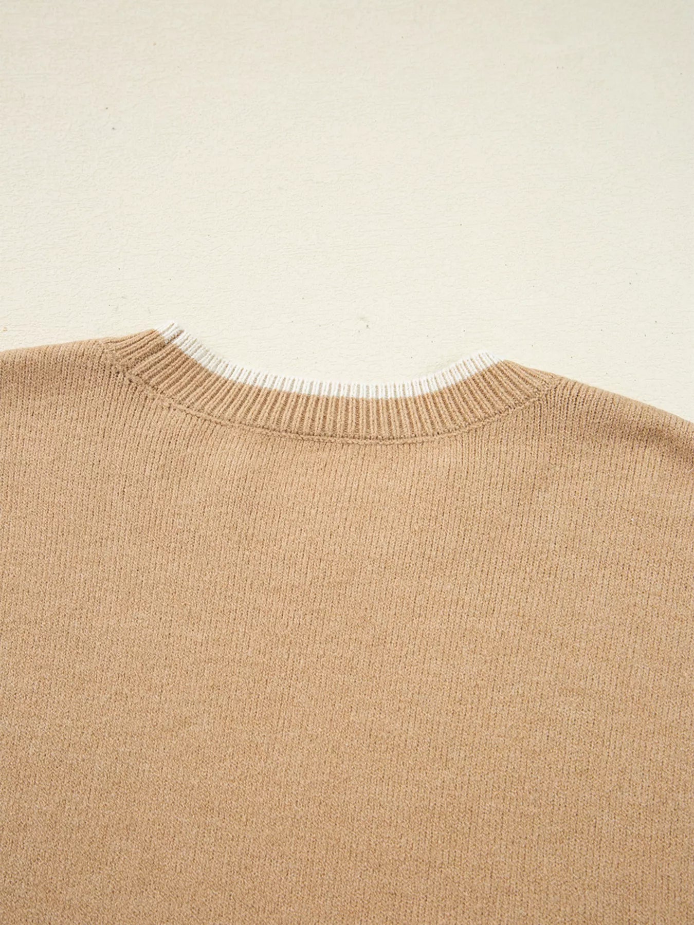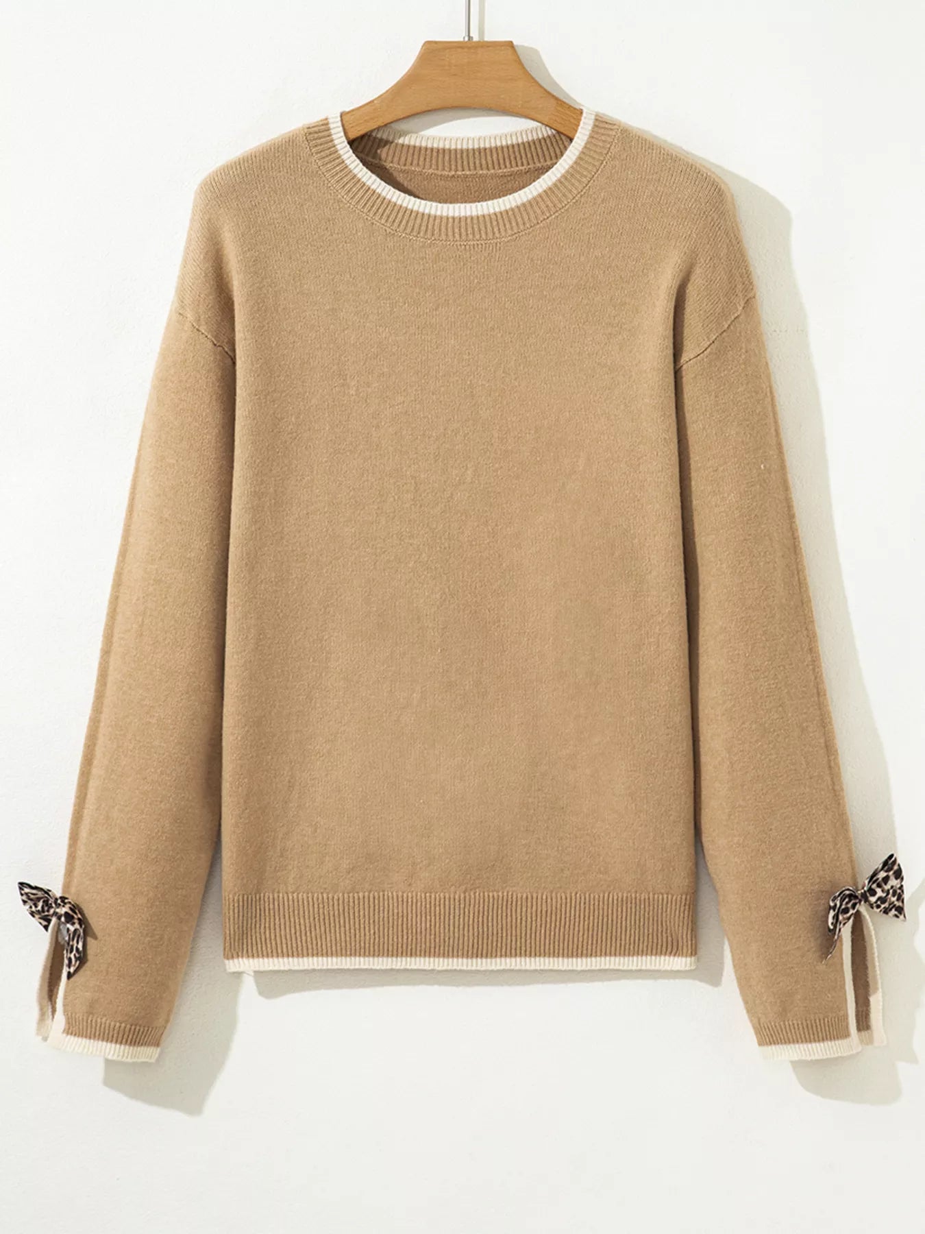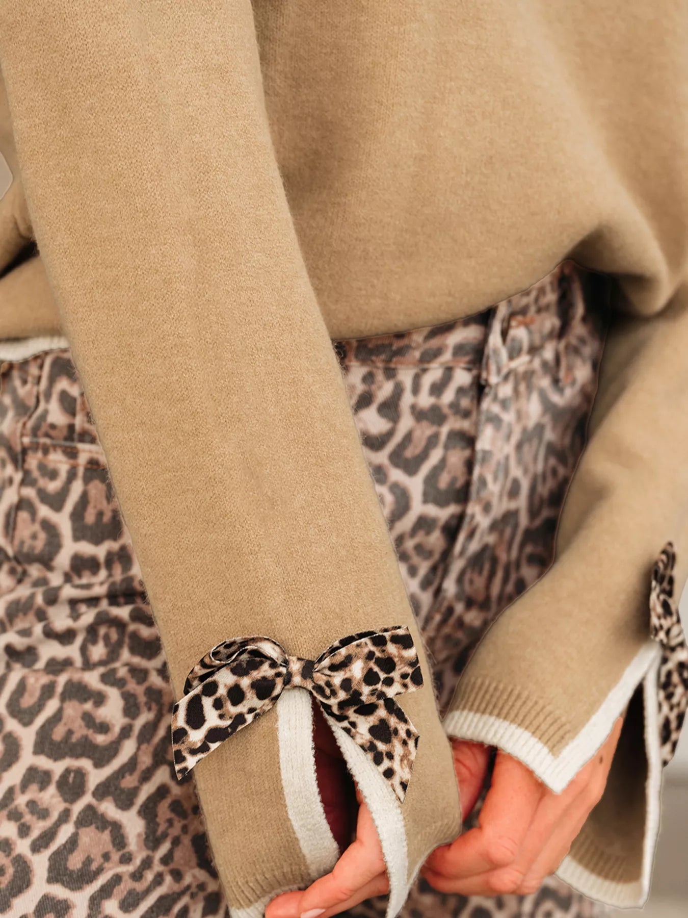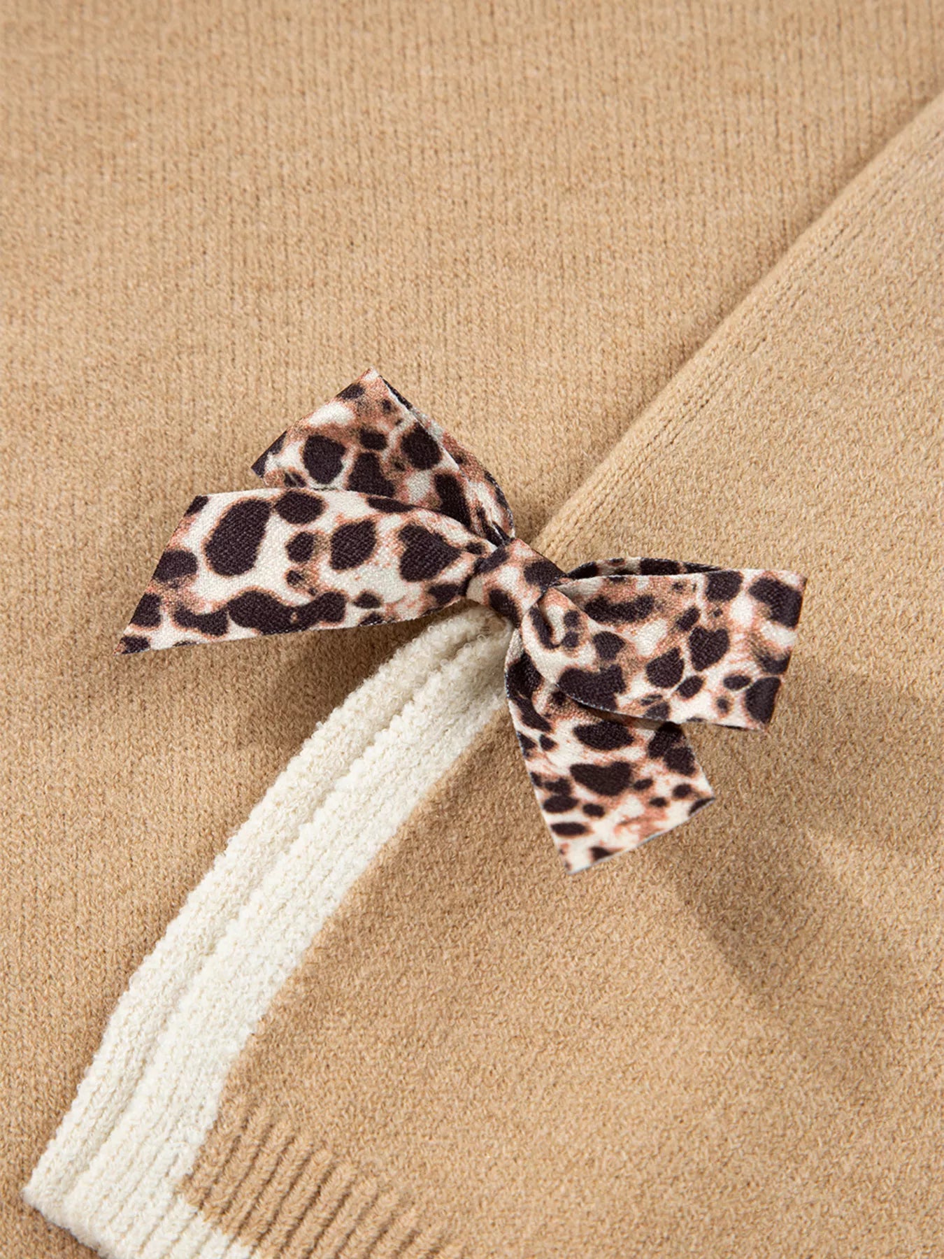 Leopard Bow Decor Split Cuff Contrast Trim Sweater