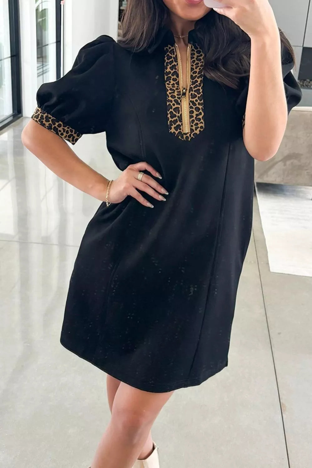 Leopard Trim Zipper Front Mini Dress