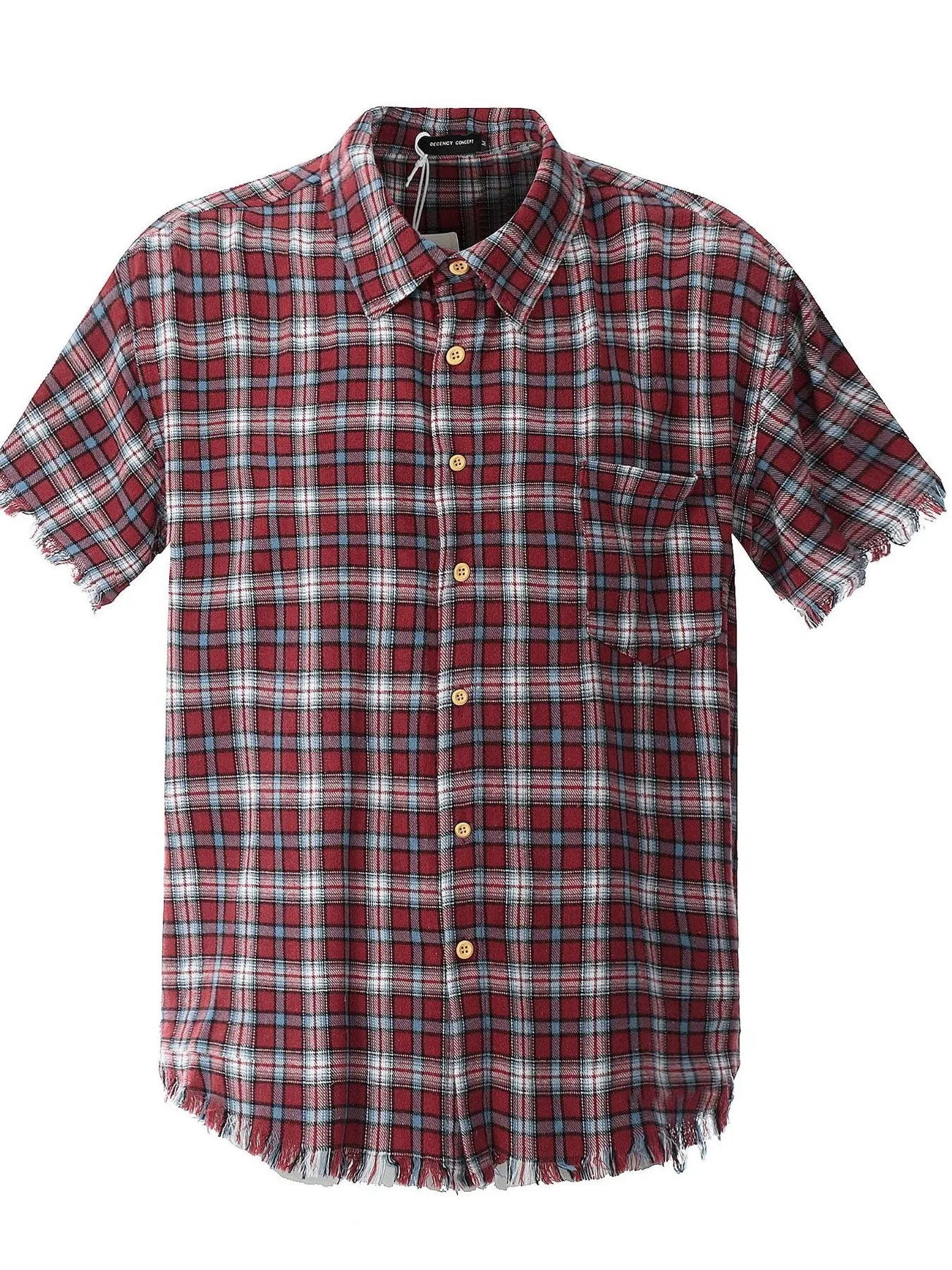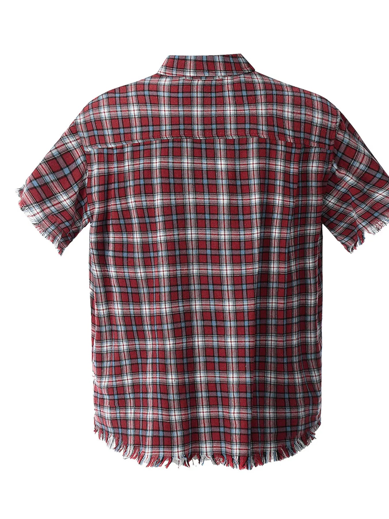 Men's Plaid Short Sleeve Shirt with Frayed Hem