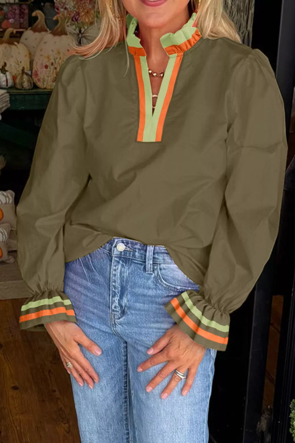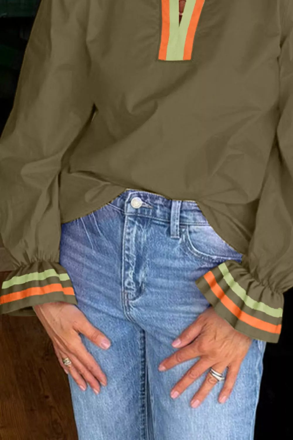 Notched Flounce Sleeve Blouse