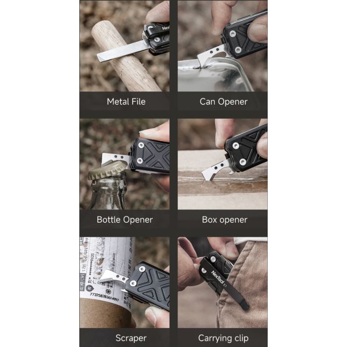 2.88" closed. Black aluminum handles. Tools include: Phillips screwdriver l Small blade l Scissors l File l Bottle opener l... Leer más...