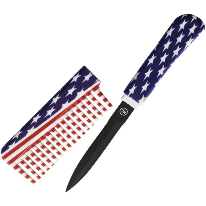 6.5" (16.51cm) overall. 3.13" (7.95cm) black finish double edge stainless blade. Synthetic knife handle and comb construction with American flag... Leer más...