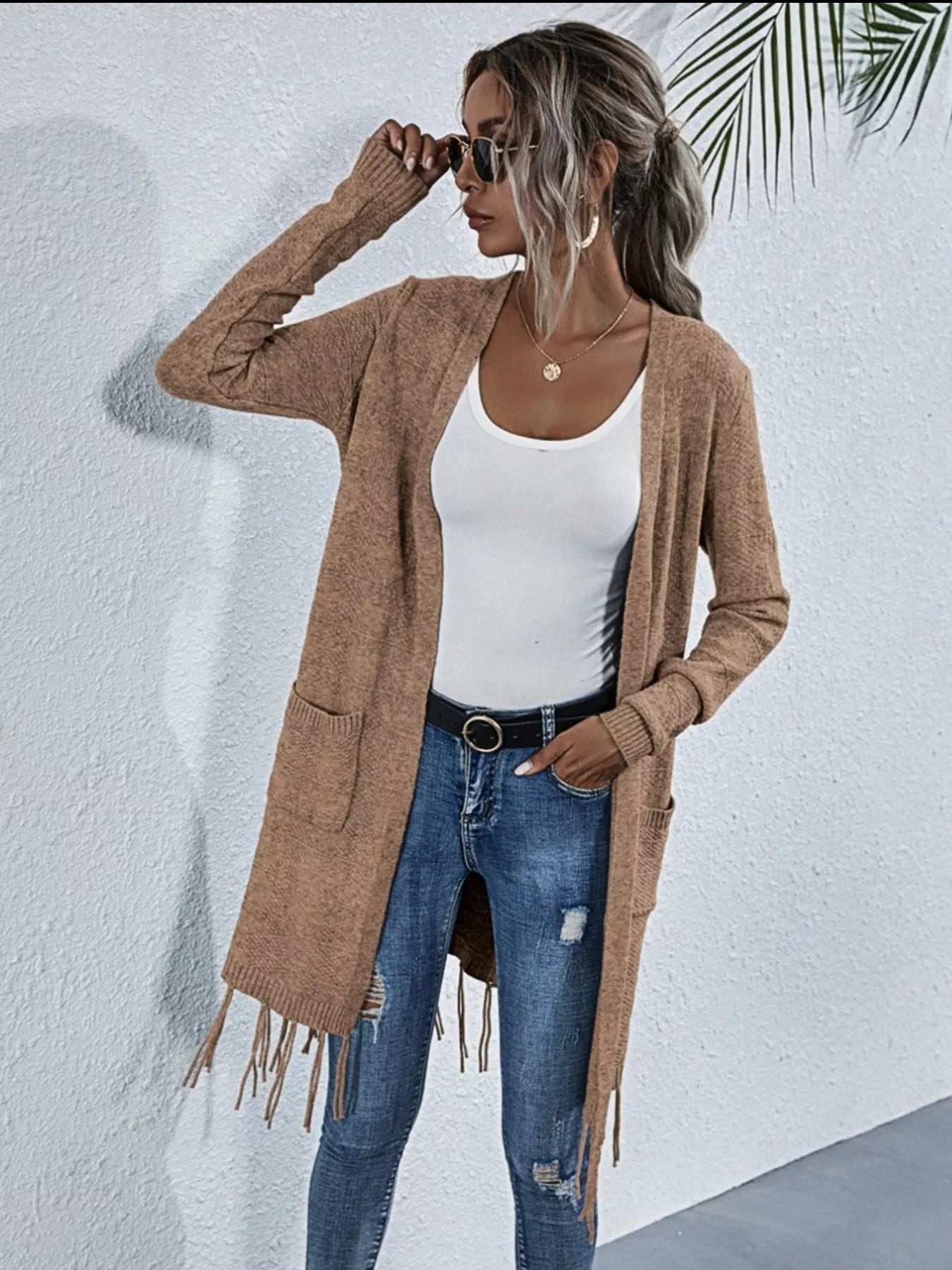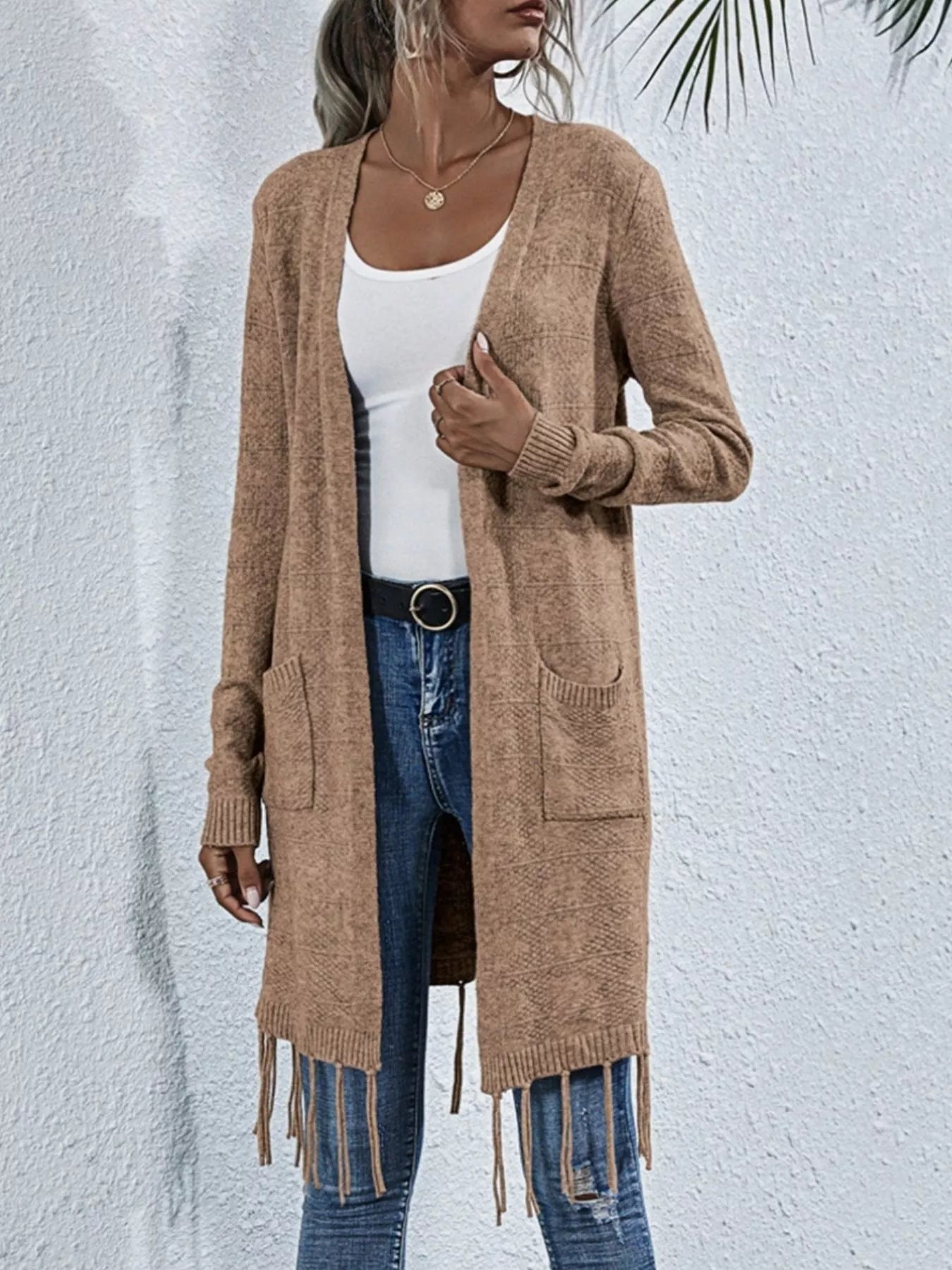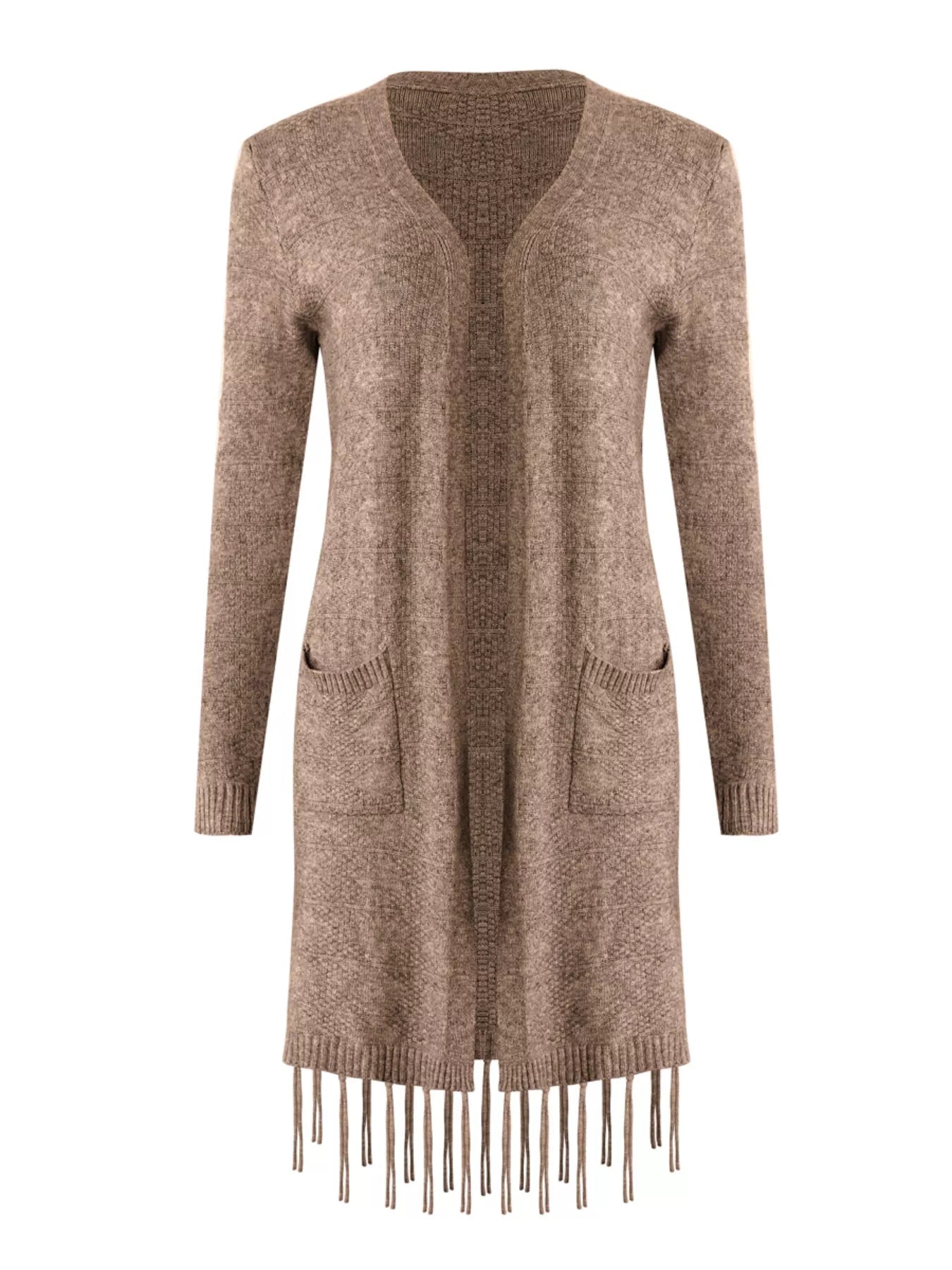 Open Front Fringe Longline Cardigan with Pockets