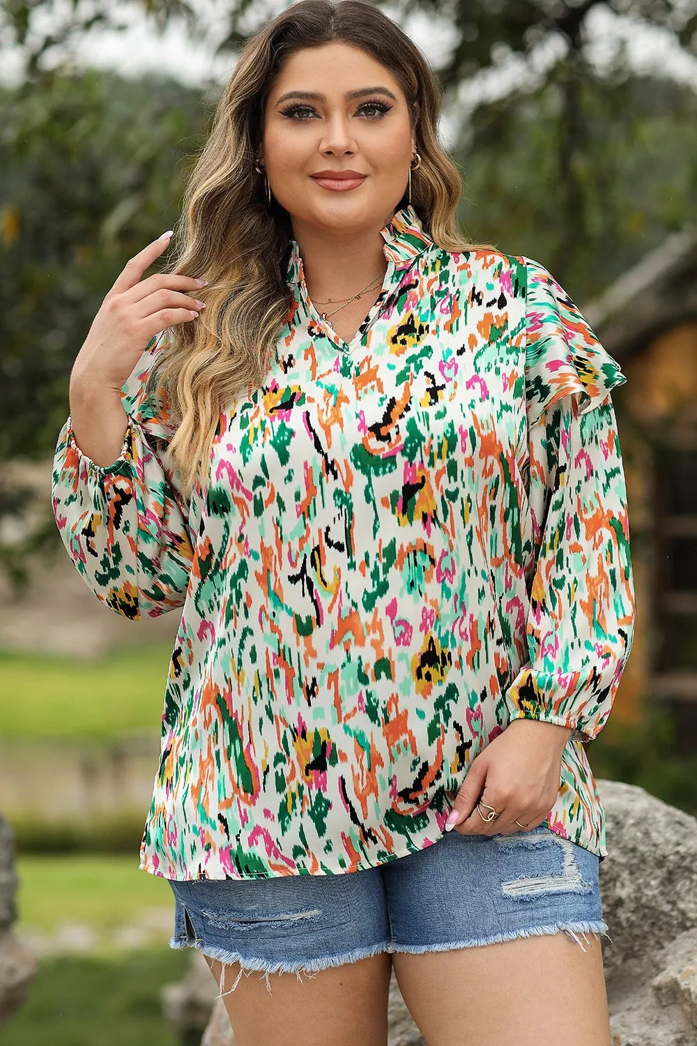 Plus Size Printed Ruffle Trim Long Sleeve Blouse