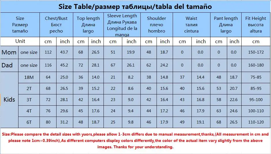 Aviso: La talla de papá y mamá no incluye pantalones. El conjunto de ropa para niños incluye 1 camiseta + 1 pantalón.