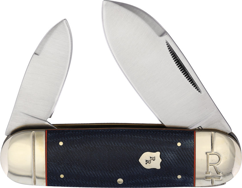 Faded Blue Jeans. 4.25" (10.8cm) closed. Mirror finish stainless spear and pen blades. Denim micarta handle. Nickel silver bolster(s). Inlay... Leer más...