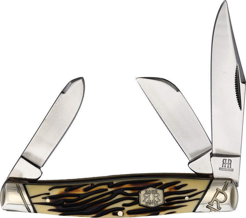 Tuff Stag. 4.25" (10.8cm) closed. Mirror finish stainless clip, sheepsfoot, and spey blades. Imitation stag handle. Nickel silver bolster(s). Inlay... Leer más...