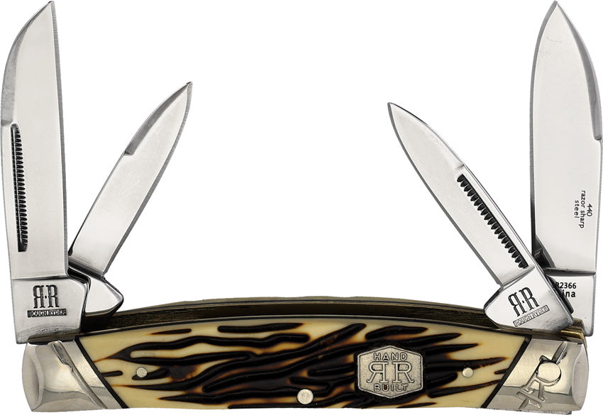 Tuff Stag Series. 3.75" (9.53cm) closed. Mirror finish stainless sheepsfoot, spear, and twin pen blades. Imitation stag handle. Nickel silver... Leer más...