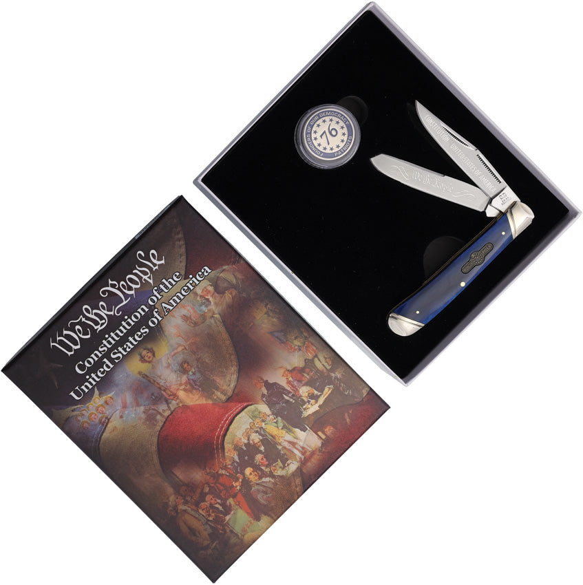 4.13" (10.49cm) closed. Stainless clip and spey blades. Blue smooth bone handle. Nickel silver bolster(s). Inlay shield. Constitution blade etching.... Leer más...
