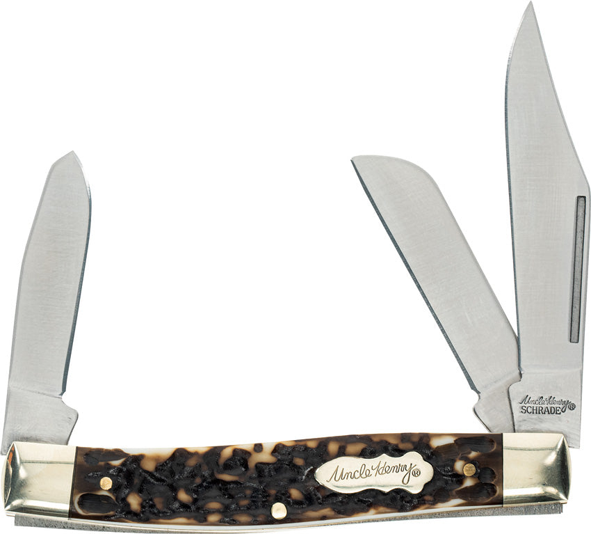 Uncle Henry. 4.25" (10.8cm) closed. Satin finish stainless clip, sheepsfoot, and spey blades. Staglon handle. Nickel silver bolster(s). Inlay shield.... Leer más...