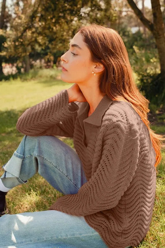 SO ME Notched Collar Wavy Texture Sweater Top