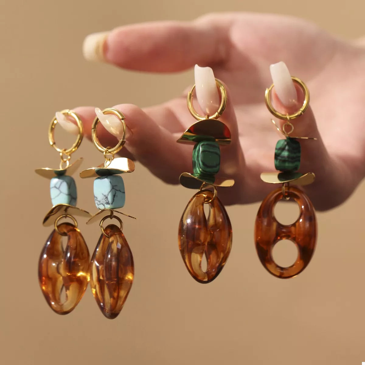 Pieces:1-pair Material:18K Gold-Plated,Resin,Stainless Steel,Turquoise Care instructions:Avoid wearing during exercise, as sweat will react with the jewelry to produce silver chloride... Leer más...