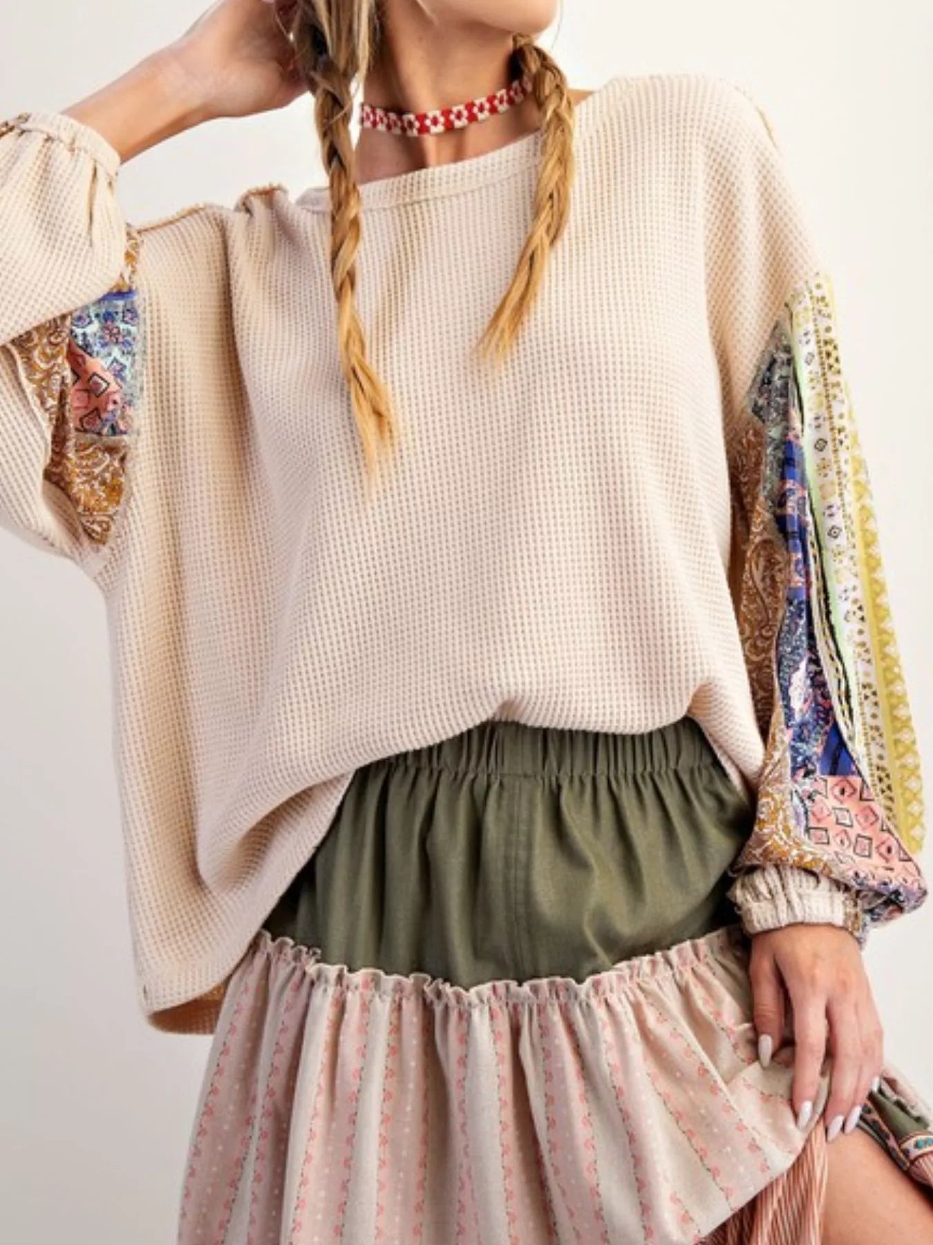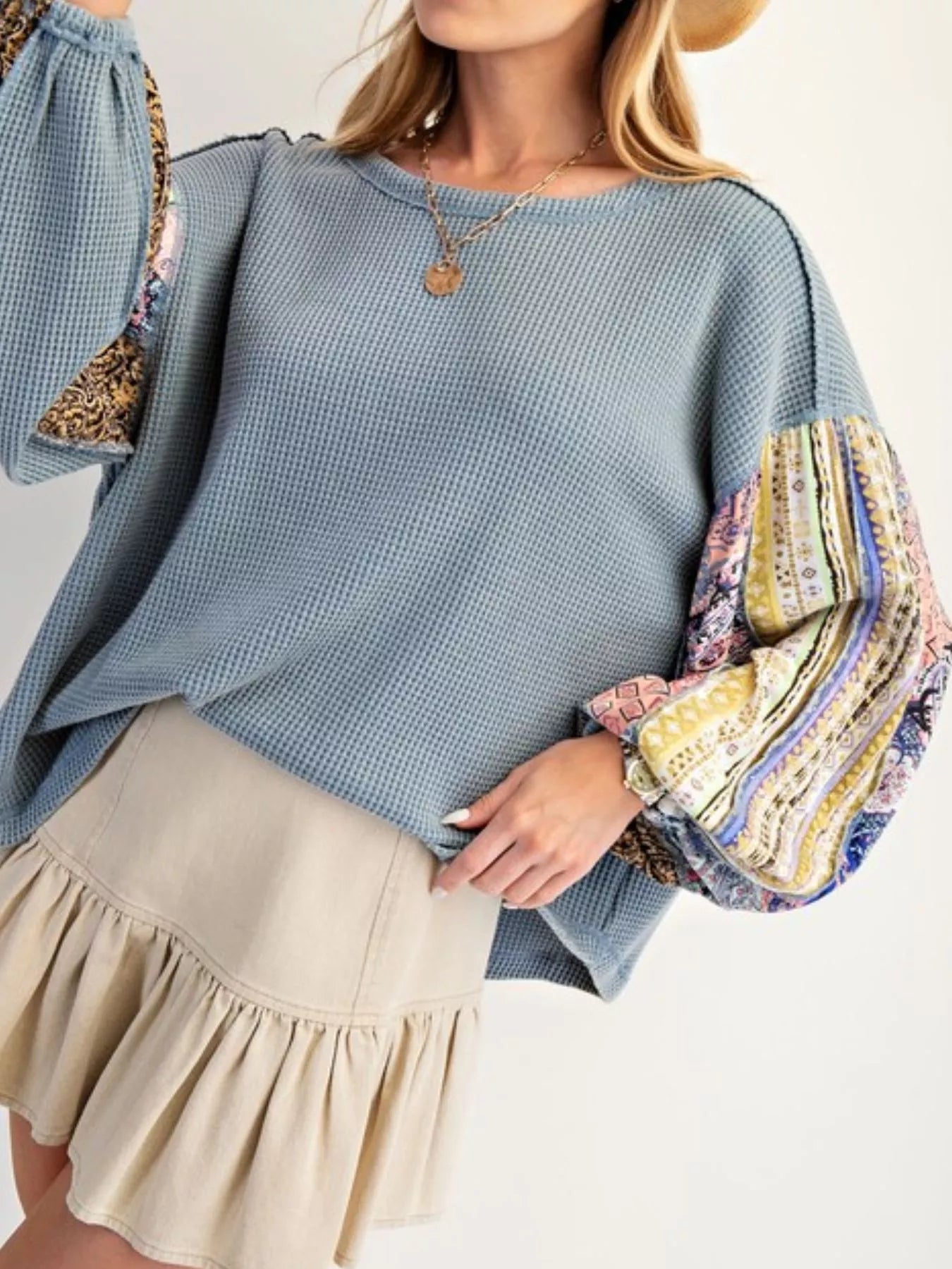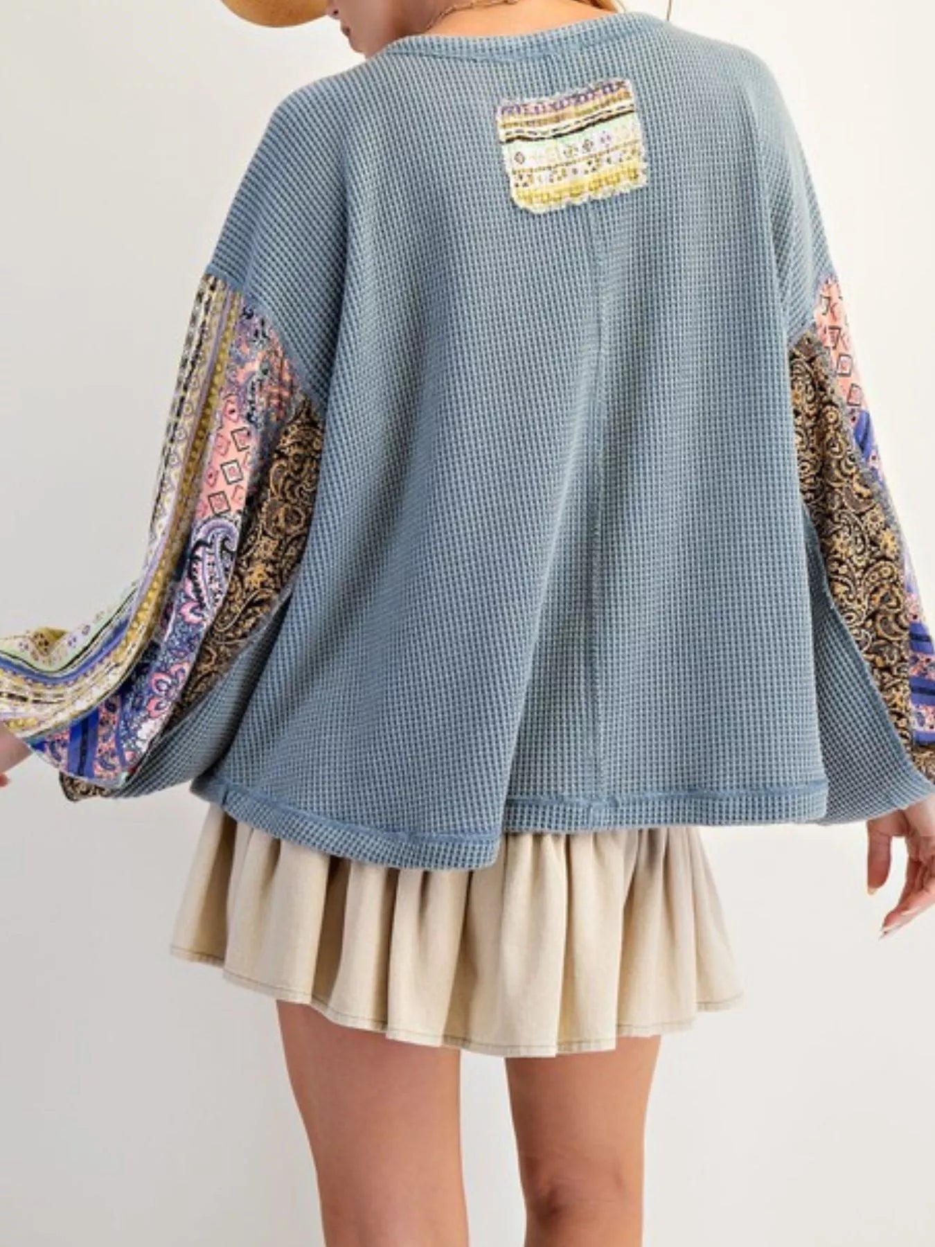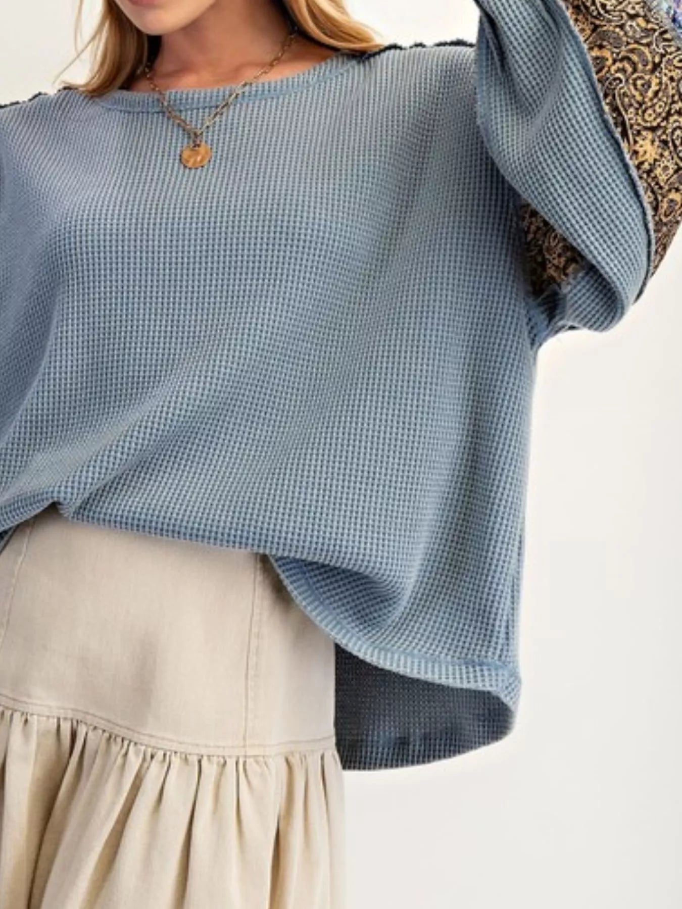 Waffle Knit Round Neck Dropped Shoulder Sweatshirt