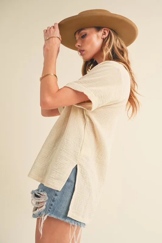Aemi + Co Side Slit Johnny Collar Short Sleeve Cotton Gauze Blouse