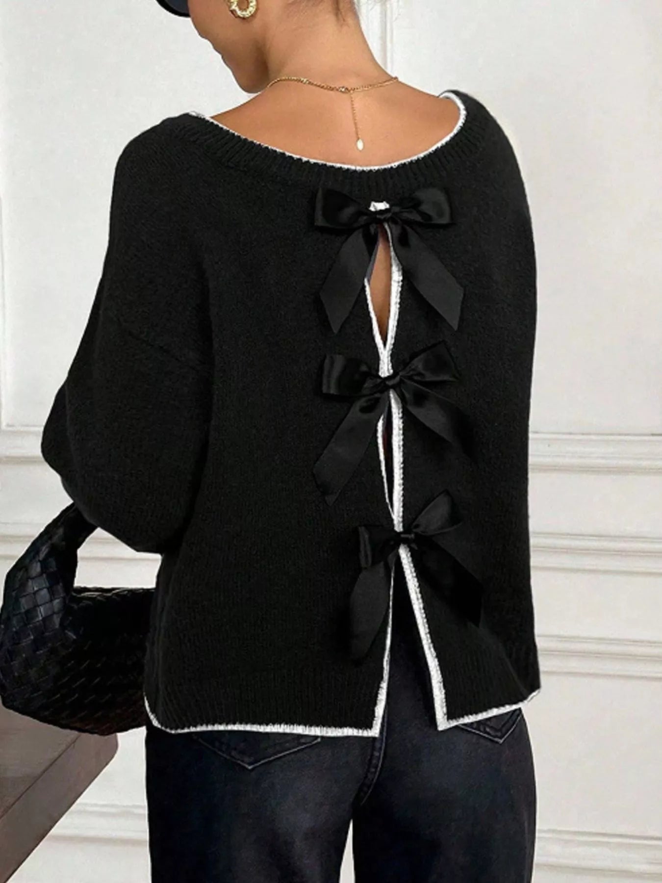 Back Bowknot Decor Round Neck Sweater