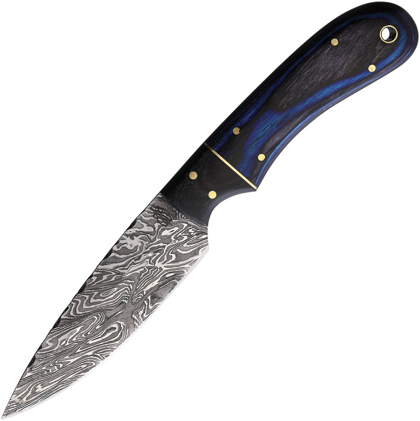 8.5" (21.59cm) overall. 4.25" (10.8cm) Damascus steel blade. Full tang. Lanyard hole. Blue and black wood and black micarta handle.... Read more