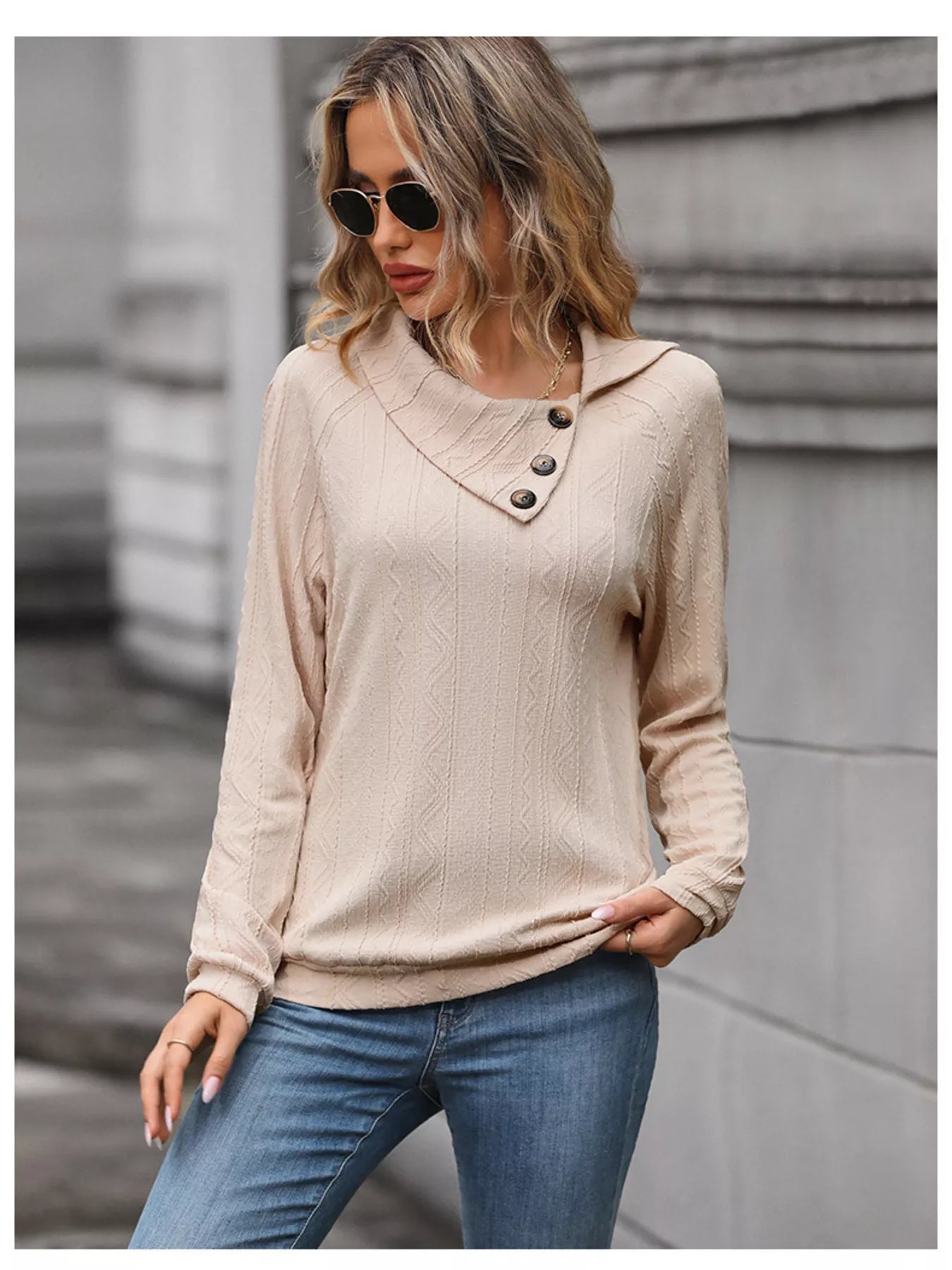 Button-Decor Long Sleeve Textured Top