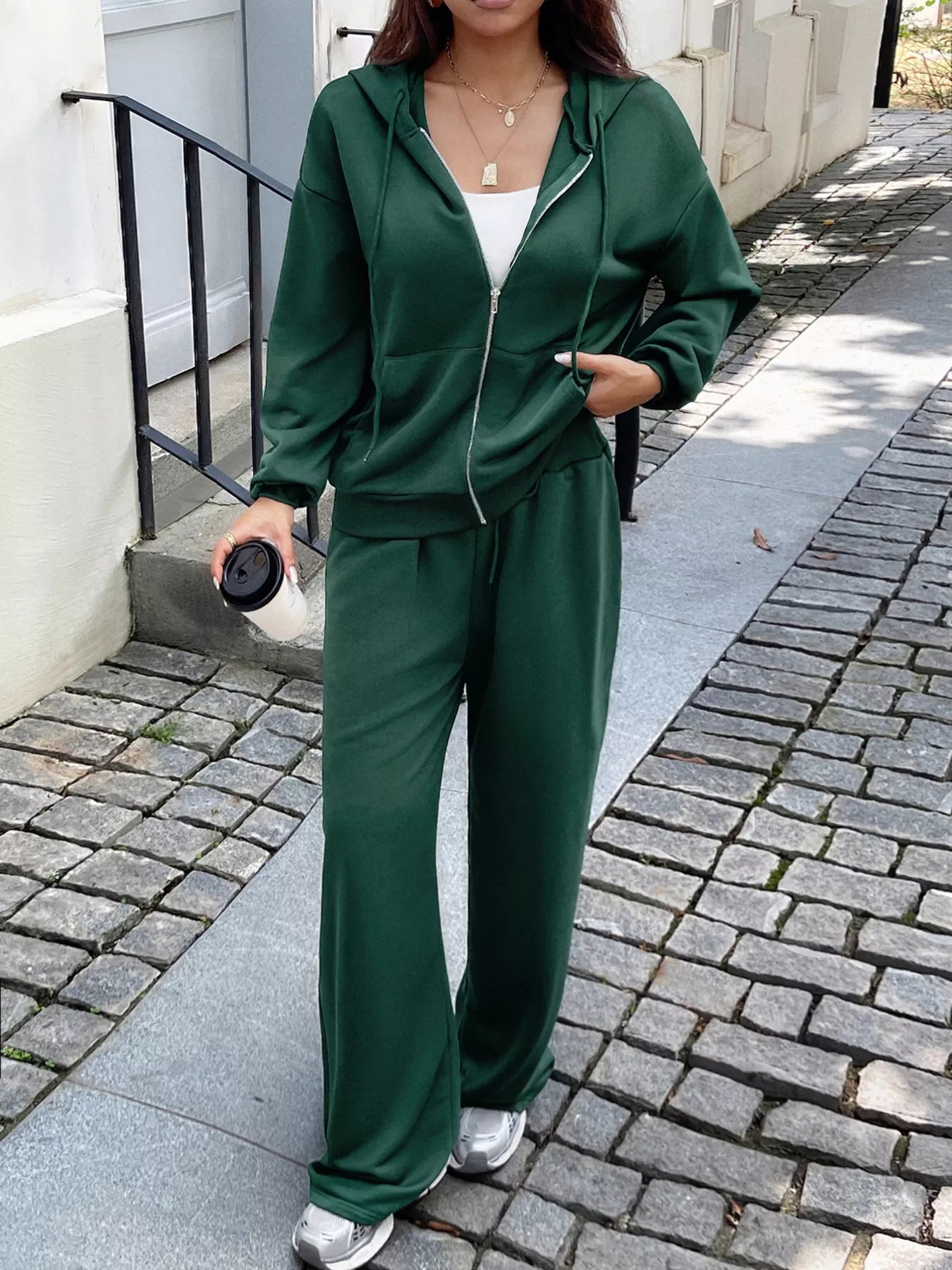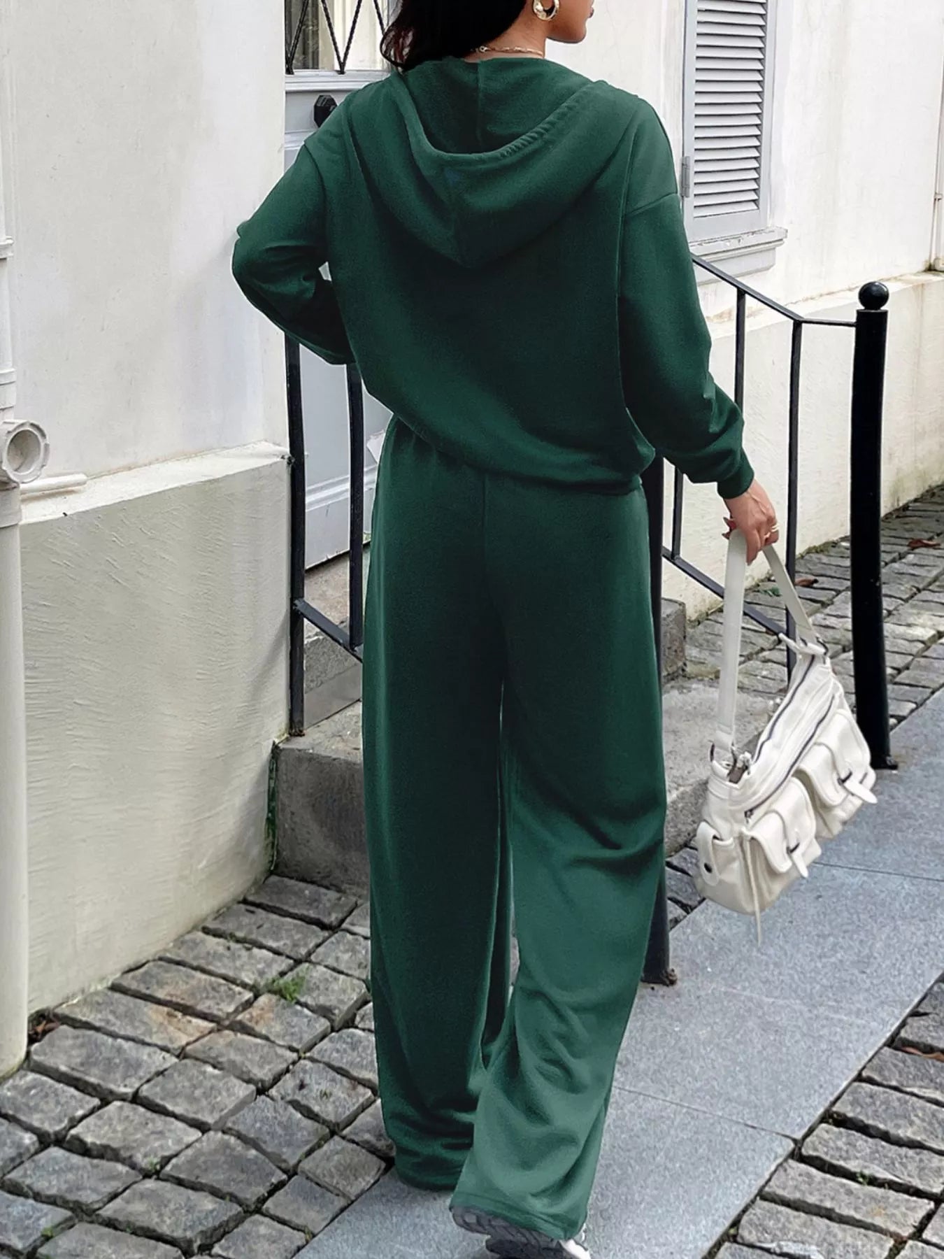 Casual Drawstring Zip Up Hoodie and Wide Leg Pants Set