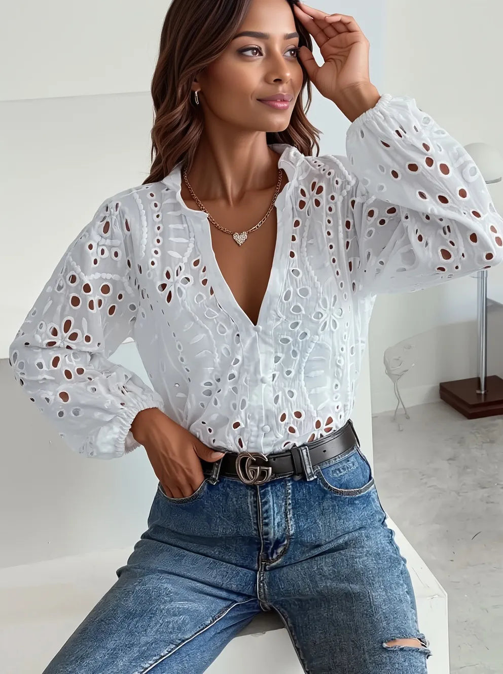 Eyelet Embroidered Button Front Shirt with Puffed Sleeves
