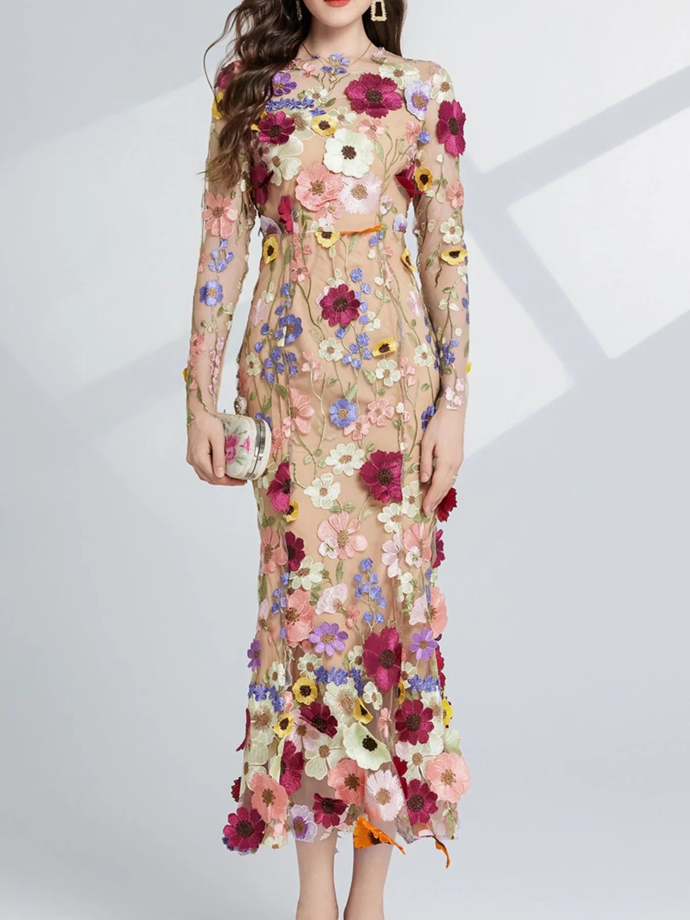 Floral Embroidered Mesh Long Sleeve Midi Dress