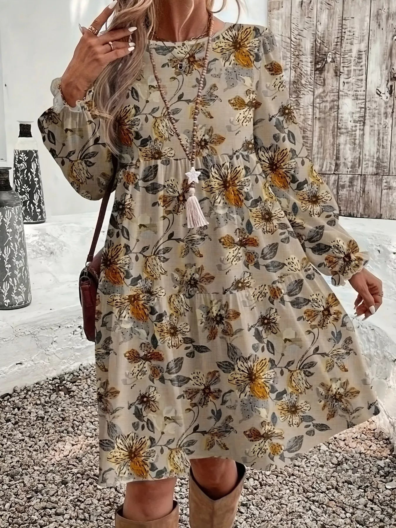 Floral Print Tiered Ruffle Hem Long Sleeve Dress
