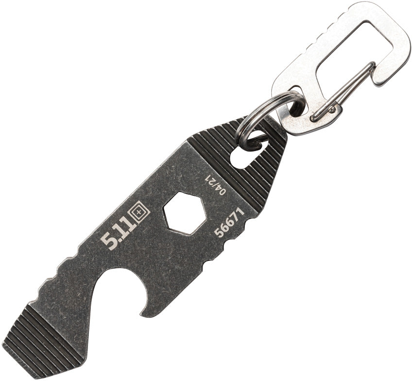 3.75" overall. Tools include: Pry bar l Bottle opener. Slotted driver. 1/4" hex bit driver/socket. Color: Gun metal gray. Stainless... Read more