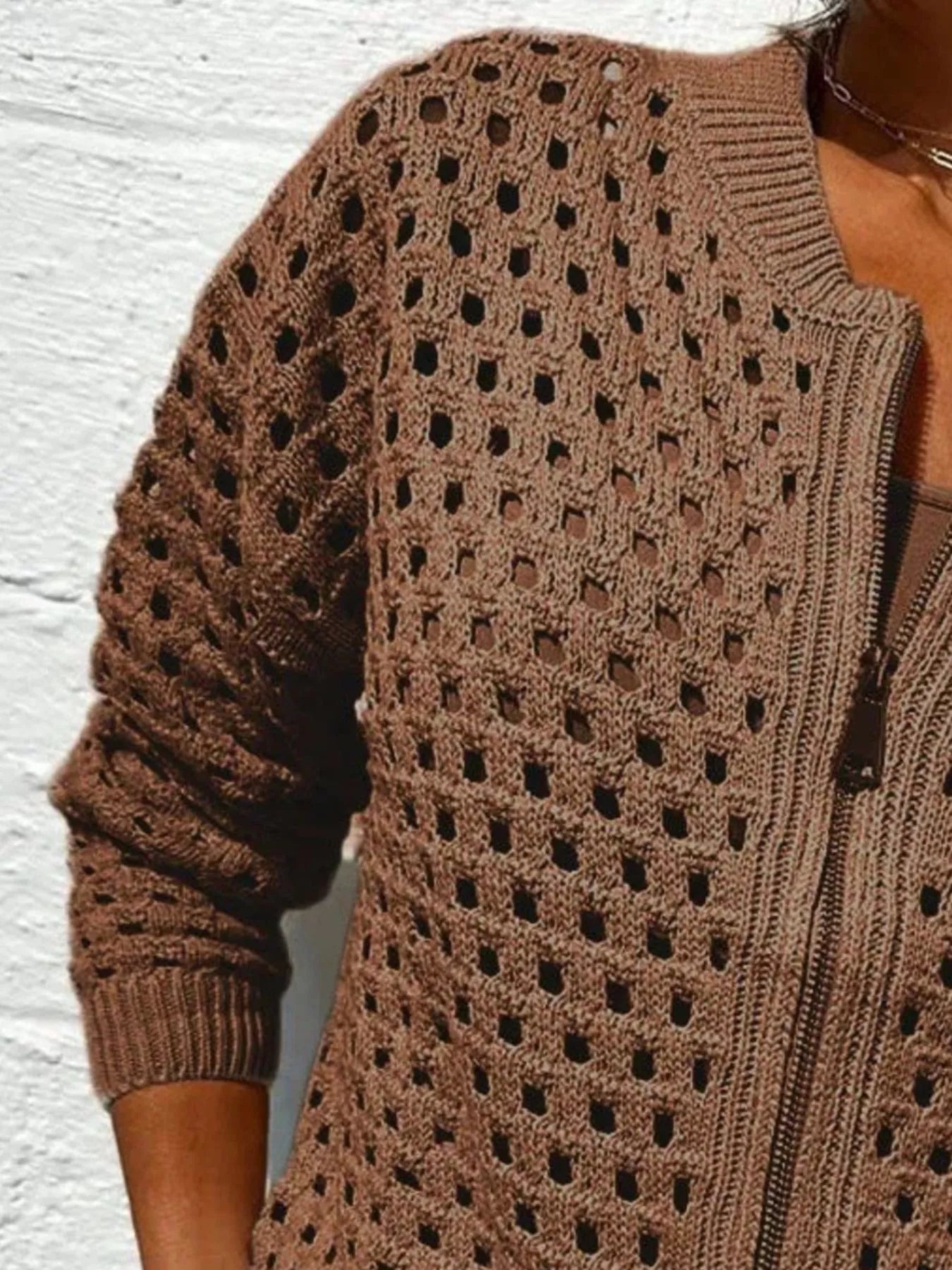 Full Size Zip Up Long Sleeve Cardigan with Eyelet Detail Plus Size