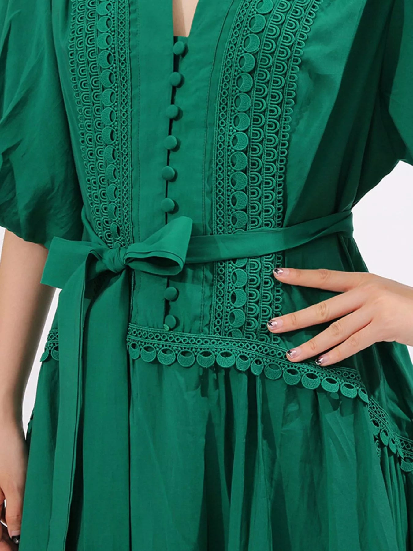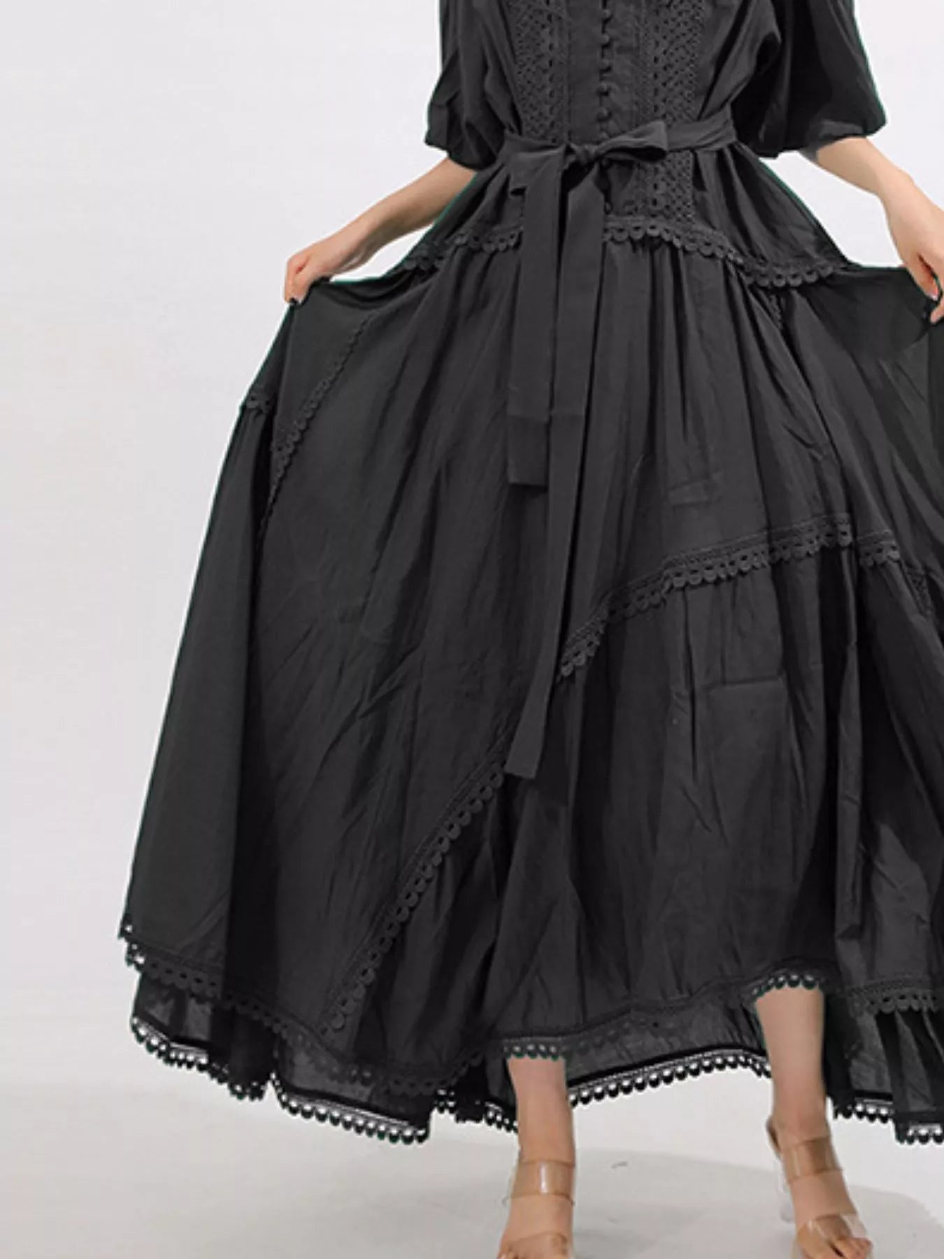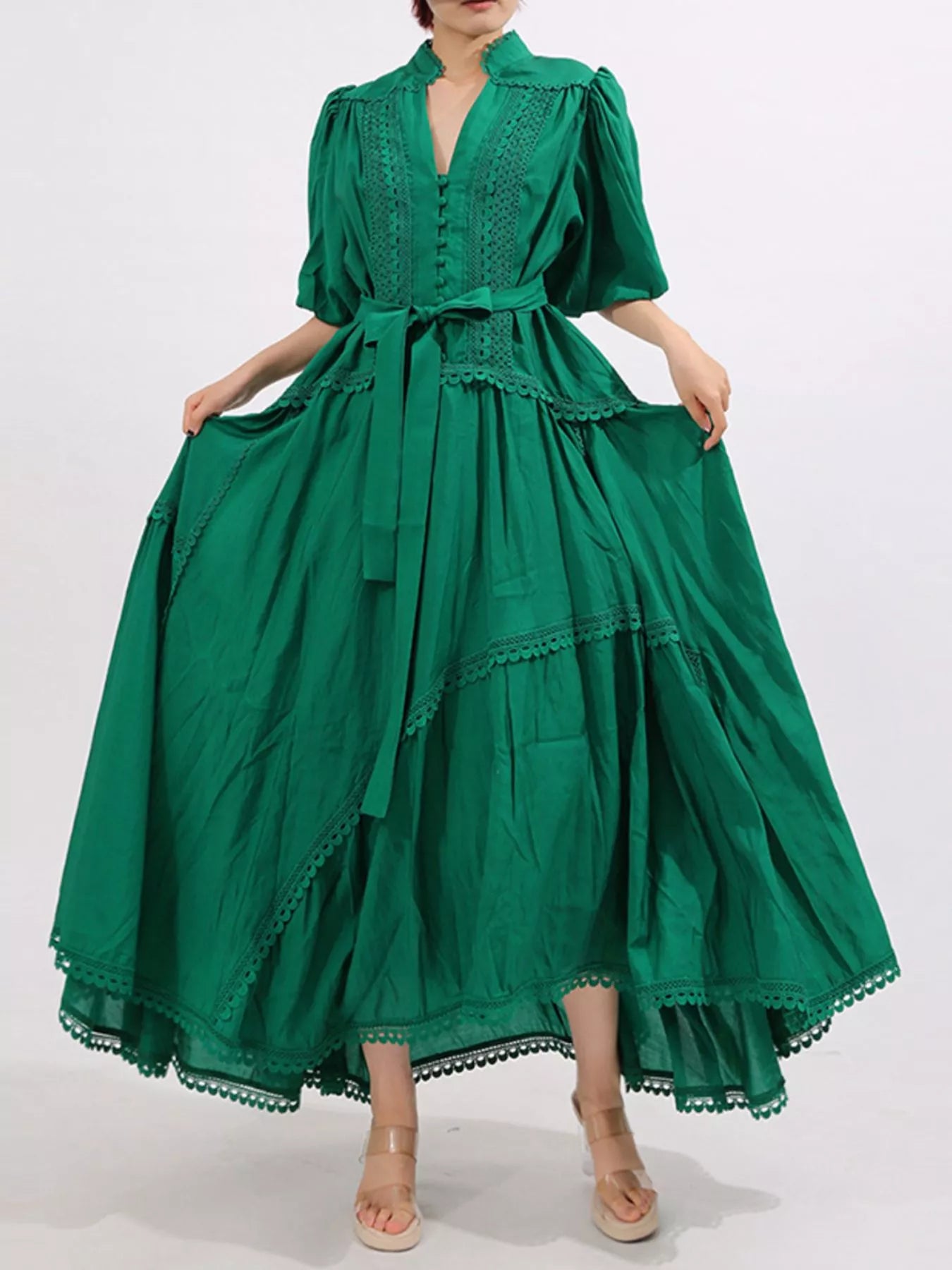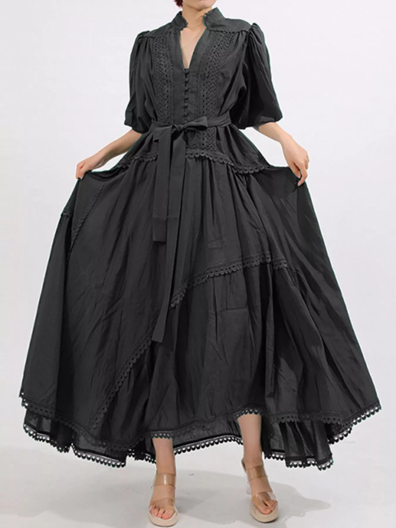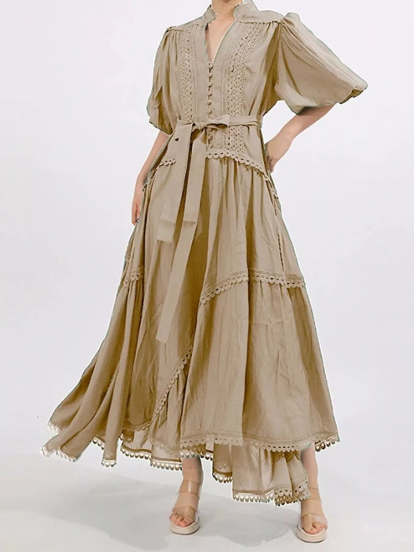 Lace Detail Notched Puff Sleeve Maxi Dress