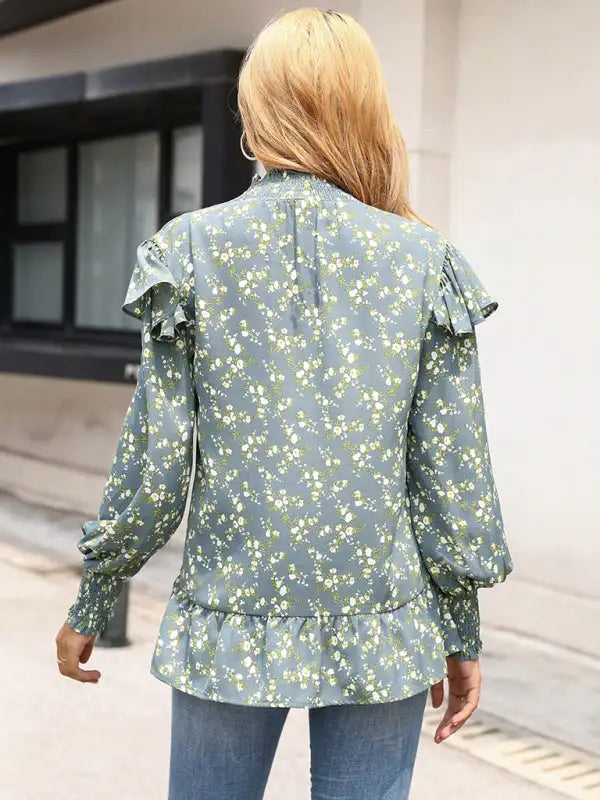 Loose Floral Stand Collar Ruffle Long Sleeve Top