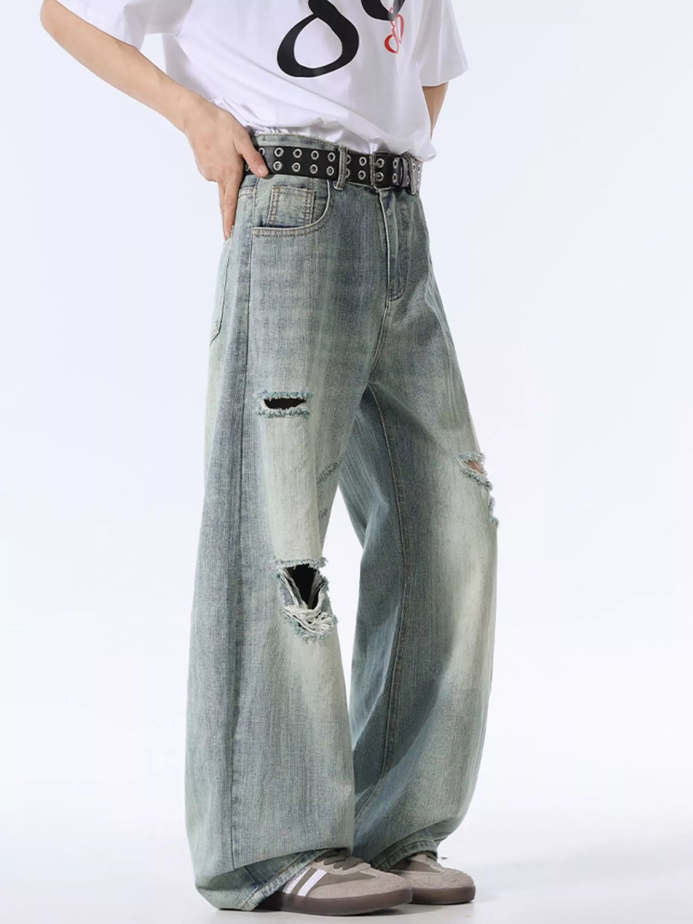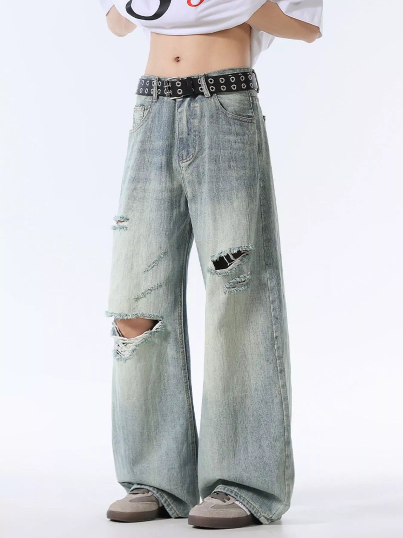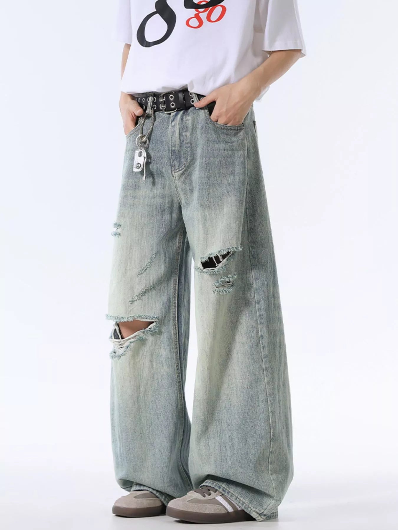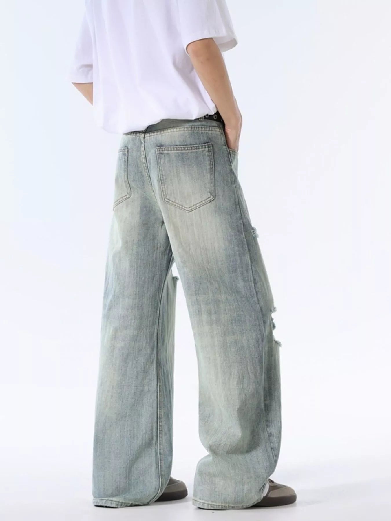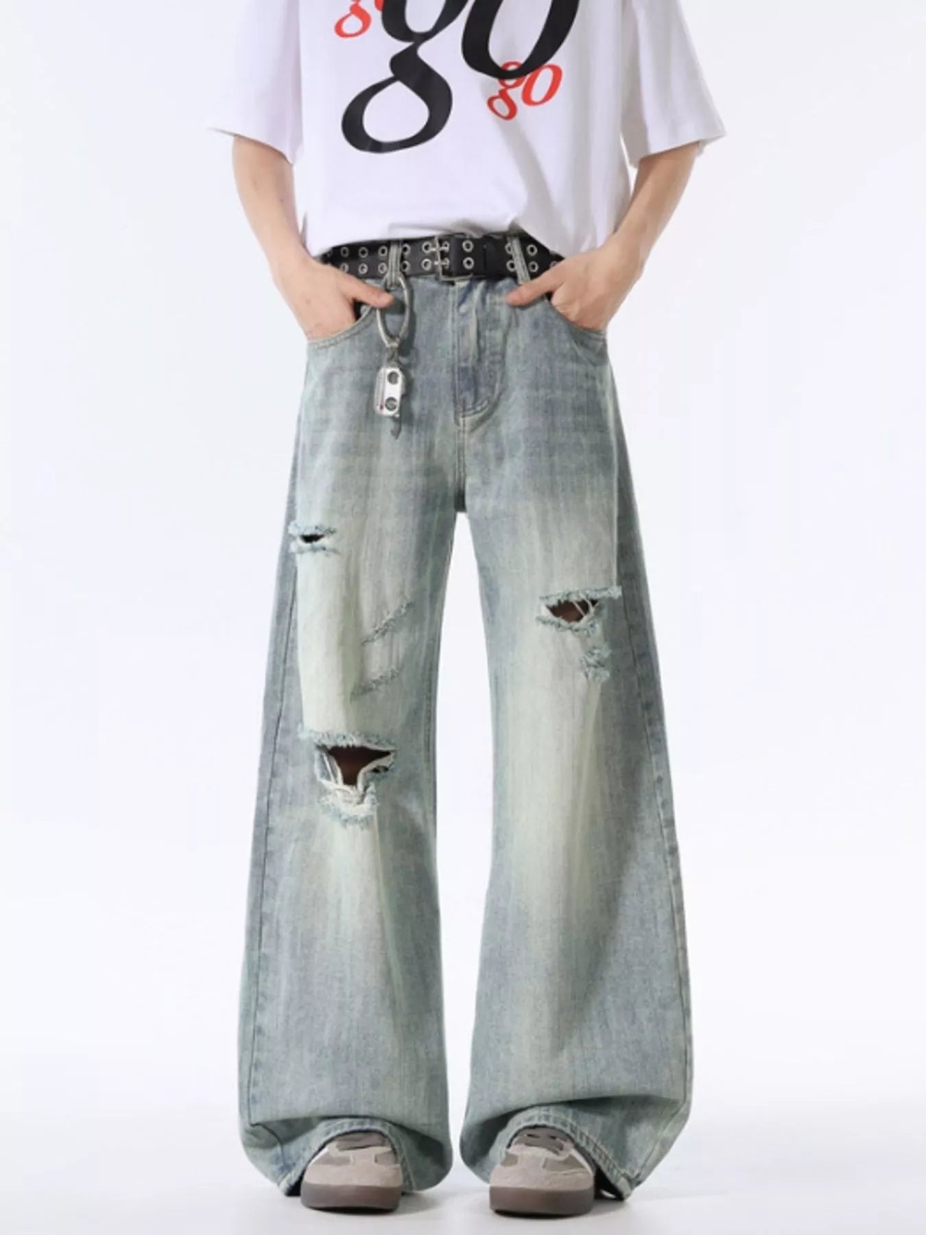 Men's Wash Distressed Wide Leg Jeans