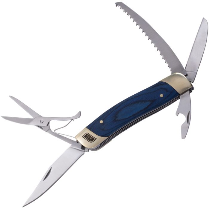 4" (10.16cm) closed. Satin finish 5Cr15MoV stainless clip and sheepsfoot blades. Blue wood handle. Brass bolster(s). Tools include: Bottle opener... Read more