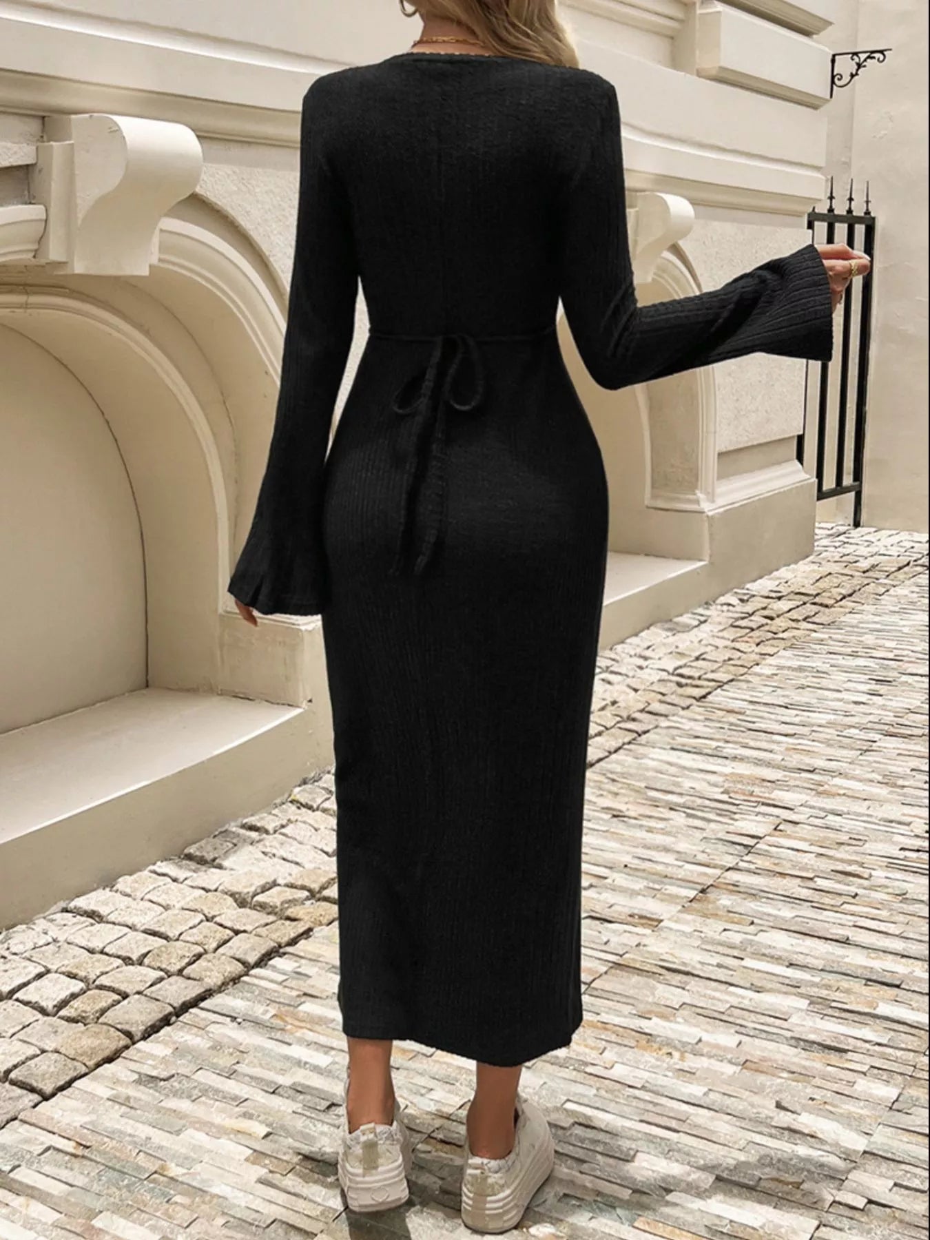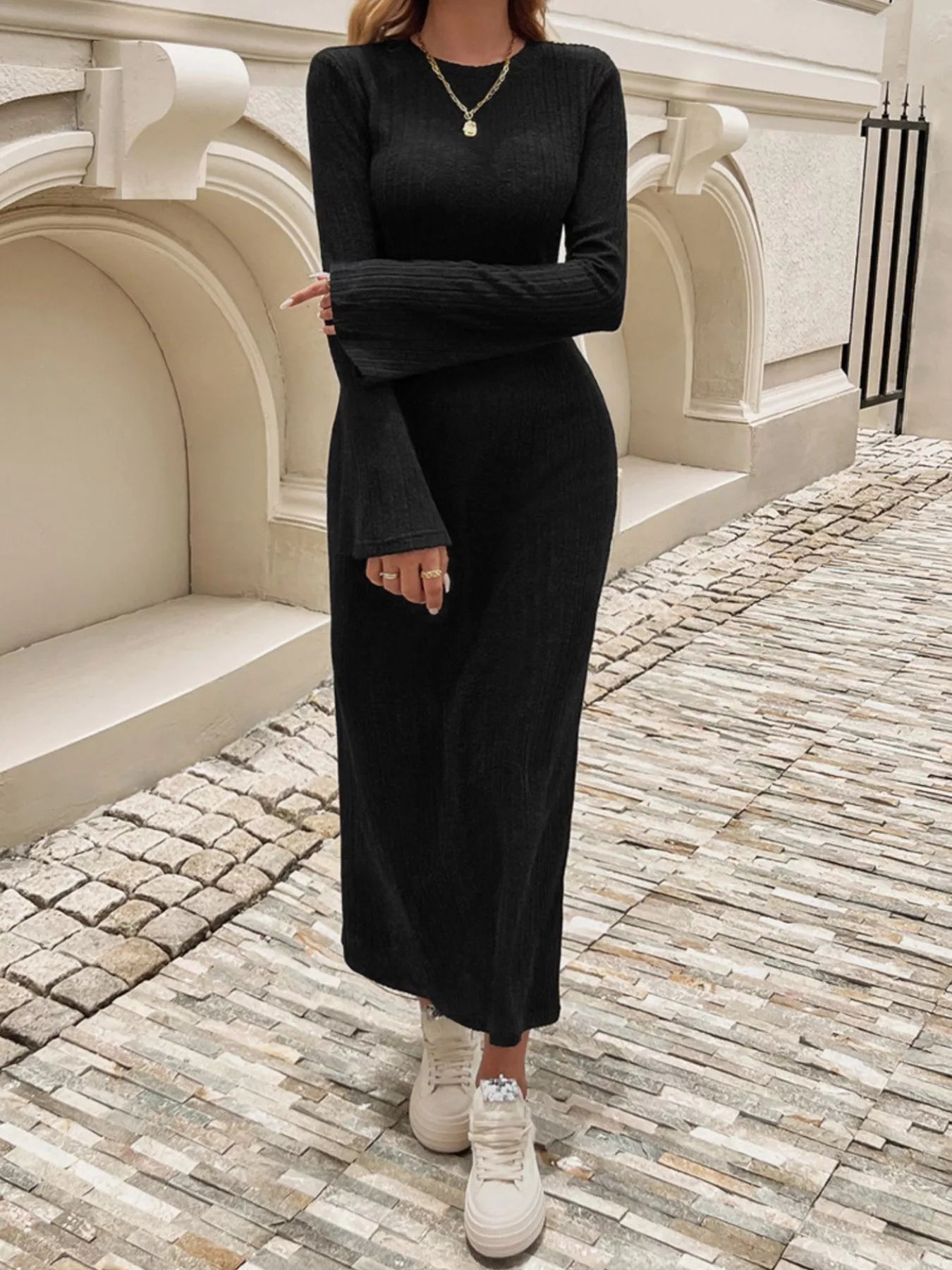 Ribbed Knit Long Sleeve Midi Dress