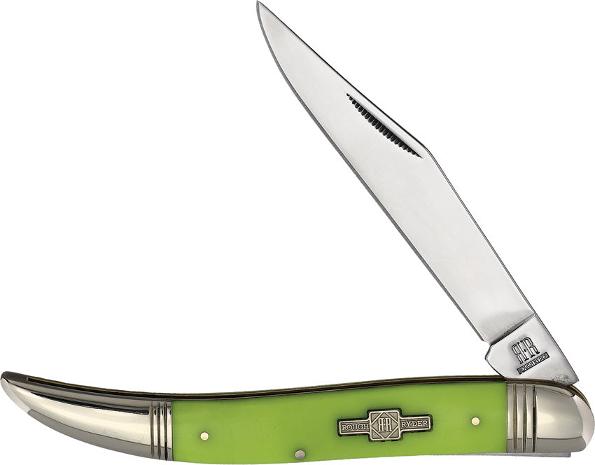 4.88" (12.4cm) closed. Mirror finish 440 stainless long clip blade. Glow in the Dark synthetic handle. Nickel silver bolster(s). Inlay... Read more