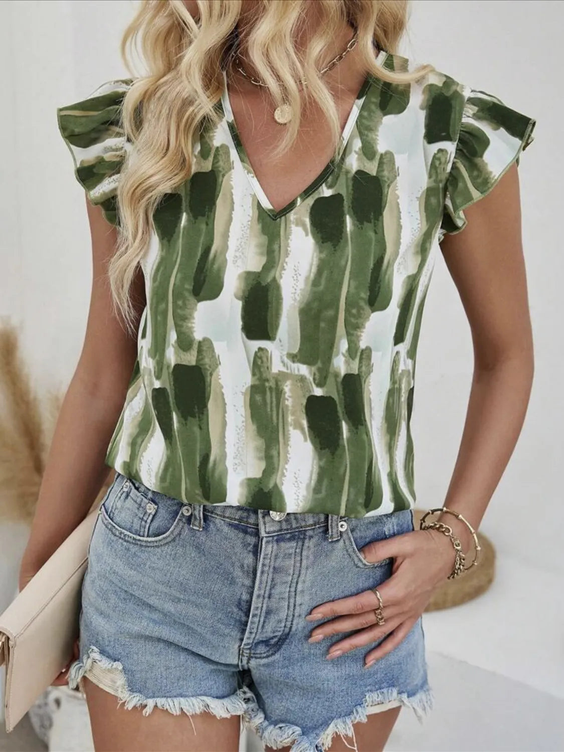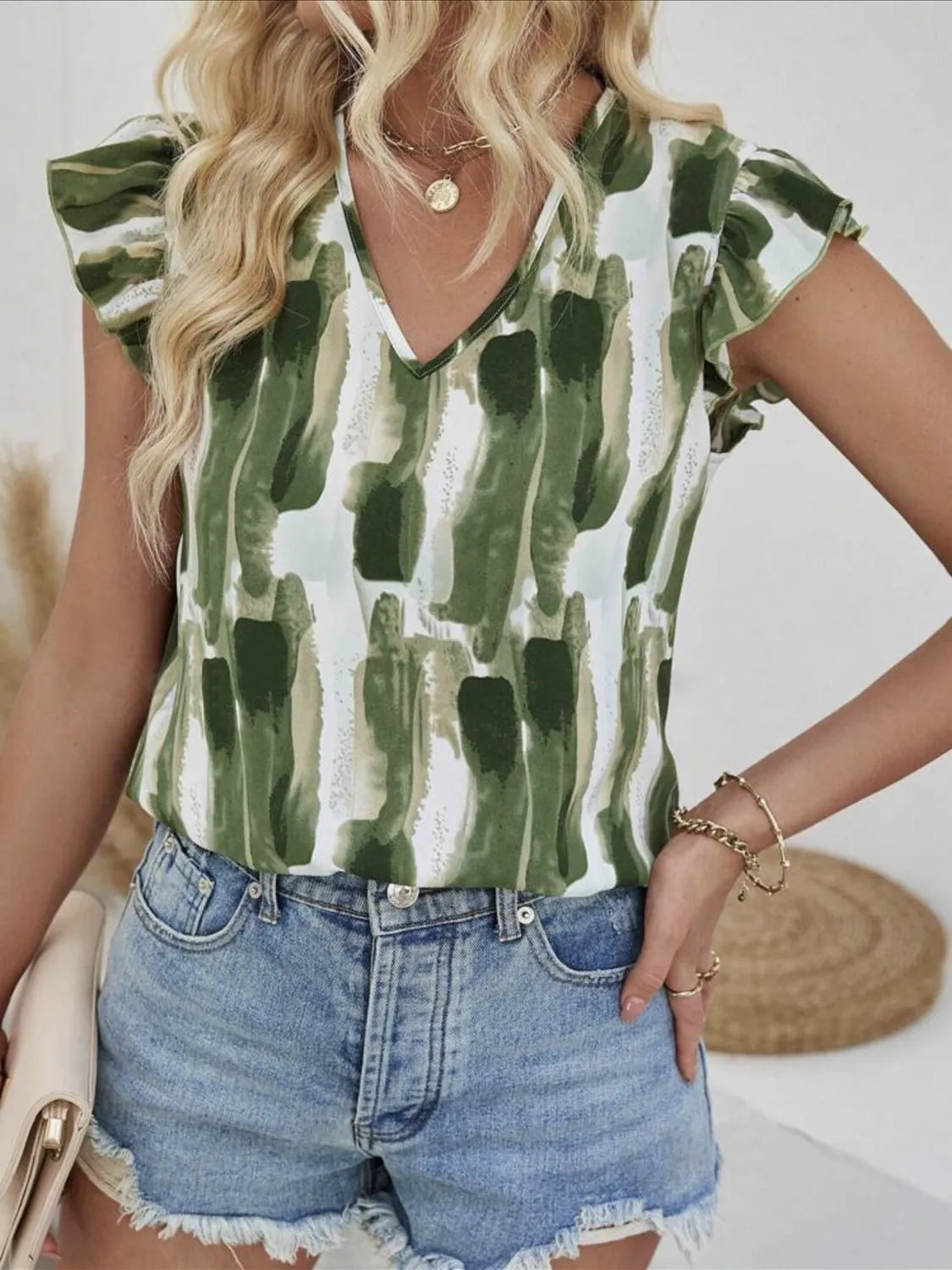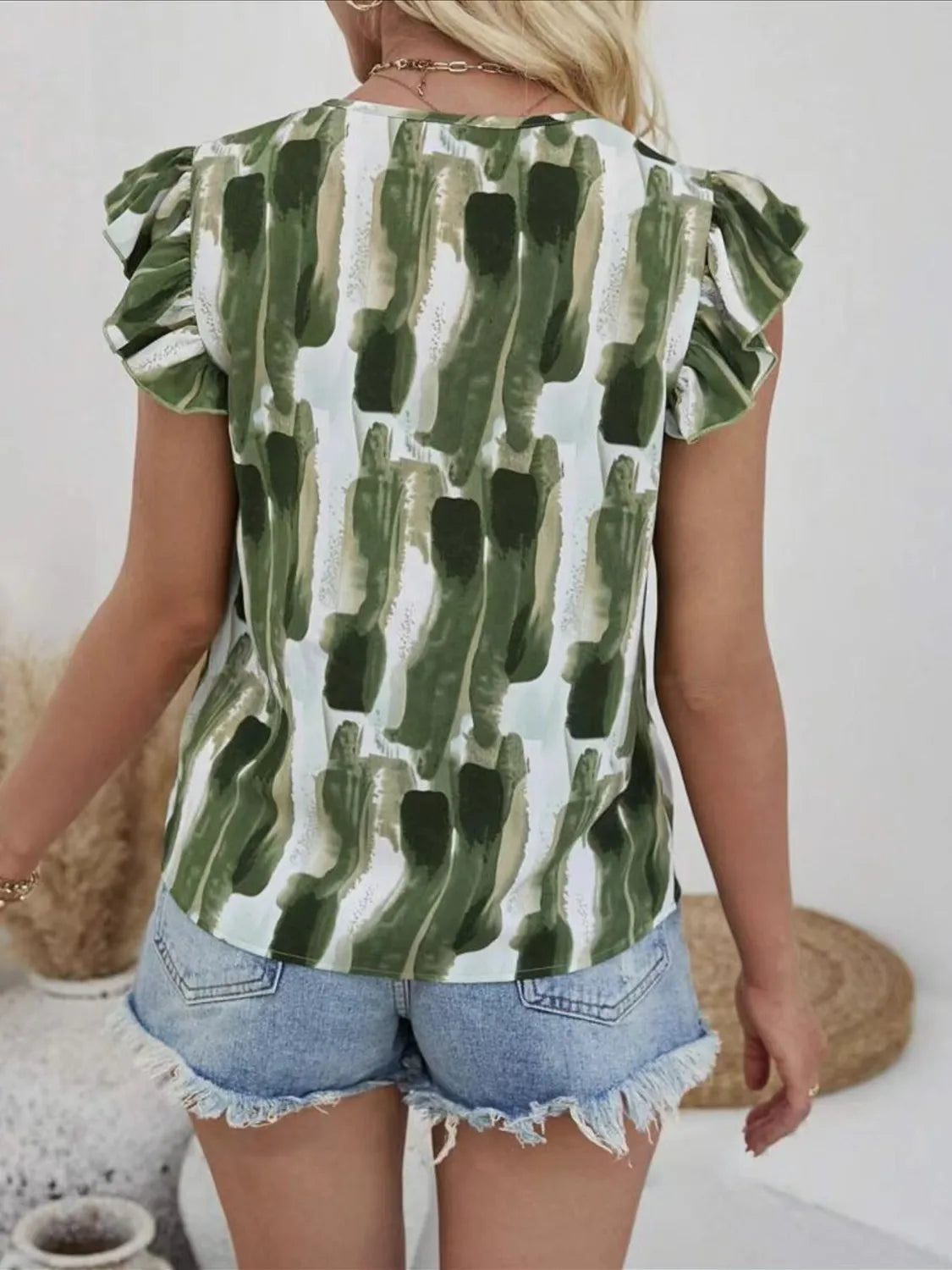 Ruffled Printed V-Neck Cap Sleeve Blouse