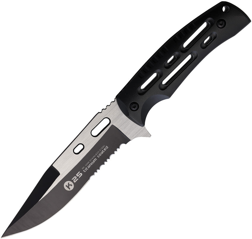 9.75" (24.77cm) overall. 5.25" (13.34cm) partially serrated stainless blade. Black aluminum handle. Full tang. Lanyard hole. Black titanium coated and... Read more