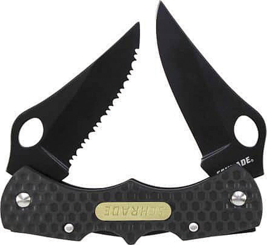 4" (10.16cm) closed. 2.75" (6.99cm) black finish 8Cr13MoV stainless standard edge and serrated clip point blades. Black textured ABS handle.... Read more