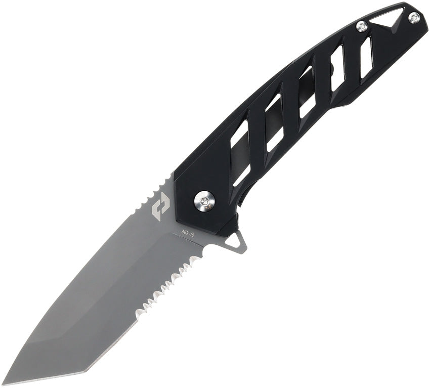 4" (10.16cm) closed. 3" (7.62cm) gray TiNi coated partially serrated AUS-10A stainless tanto blade. Black stainless handle. Extended tang. Lanyard... Read more